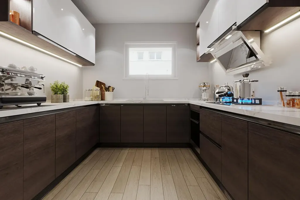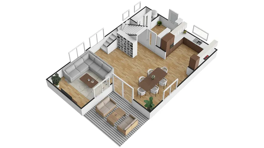V přízemí domu se kromě technické místnosti a samostatné toalety nachází srdce domova, obývací pokoj (46 m) propojený s jídelnou. Dále se v přízemí nachází kuchyňský kout (11,3 m). Možnost vzhledu kuchyňské linky je na přiložené vizualizaci. Vstup na terasu tvoří francouzské okno, které se nachází v jídelní části domu. V prvním nadzemním podlaží je projektována ložnice (21,1 m), dva dětské pokoje (15,5 a 16 m), koupelna (8,6 m) a samostatné WC.