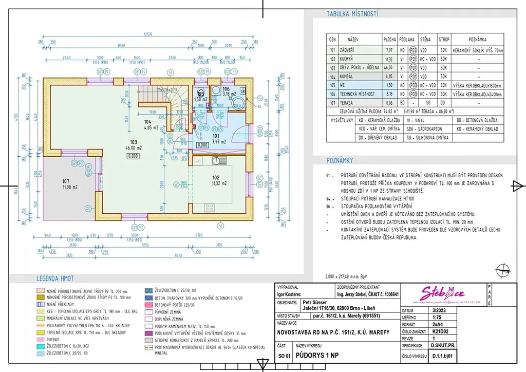 Dům je navržen s ohledem na moderní domácnost. Vytápění bude mít na starosti tepelné čerpadlo v kombinaci s podlahovým topením.