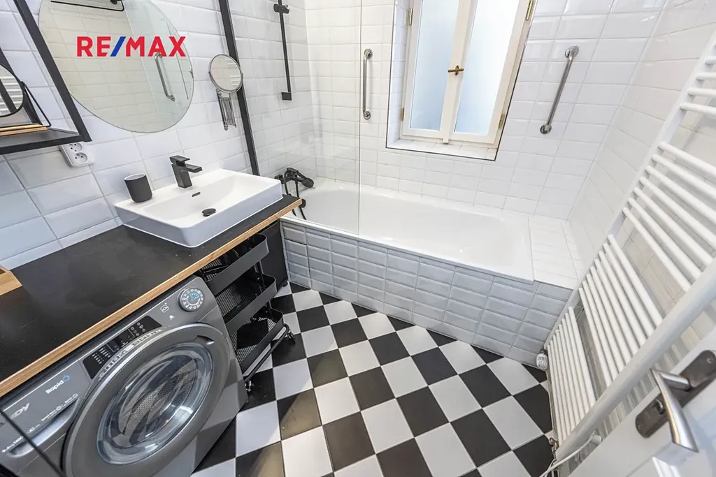 Koupelna je vybavena vanou a pračkou, WC je samostatné. Byt je kompletně zařízený nábytkem, takže se můžete okamžitě nastěhovat bez dalších investic.