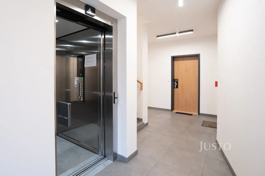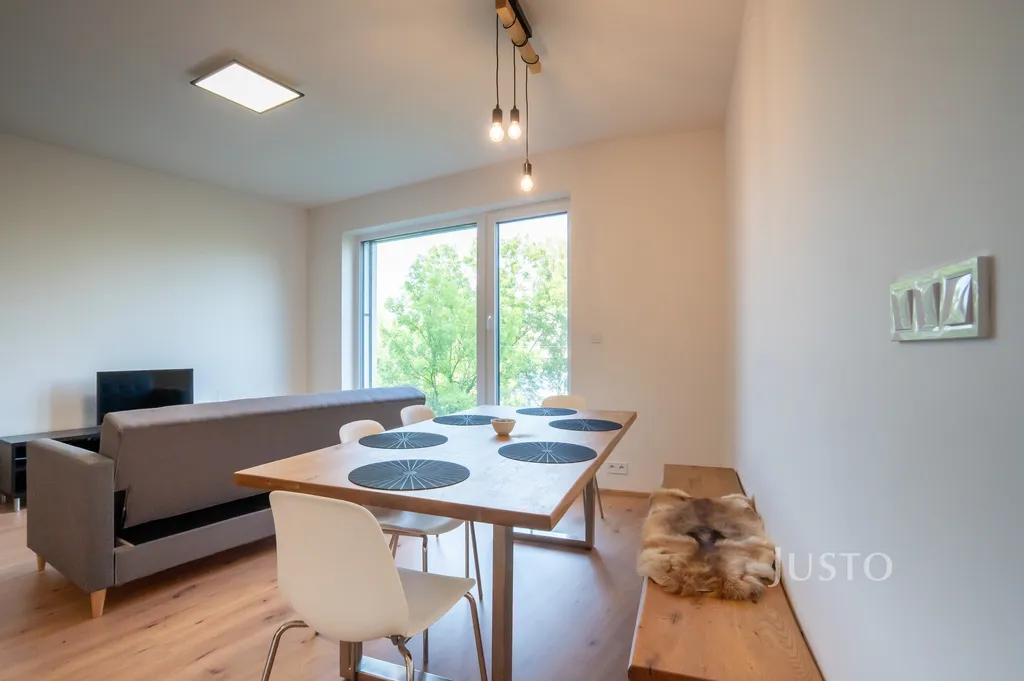 Byt je kompletně vybaven nábytkem a spotřebiči – moderní kuchyňská linka s indukční varnou deskou, myčkou, inteligentní mikrovlnnou troubou, pohodlná sedačka, televize. Po dohodě je možné doplnit další úložné prostory nebo vytvořit pracovní kout v ložnici.