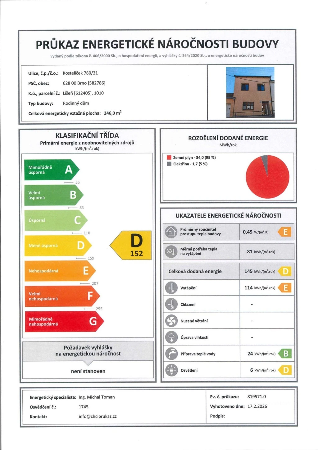| Ukazatel energetické náročnosti | 152 kWh/m2 za rok |