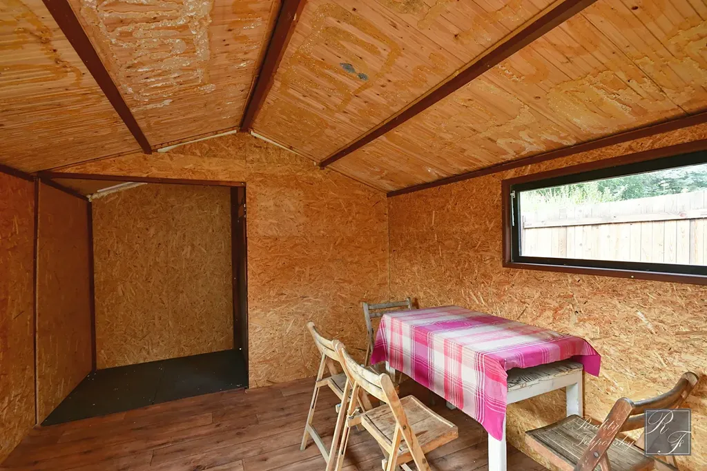 Na zahradě je stavba bez č. p. i č. ev, zapsaná v katastru nemovitostí, se zastavěnou plochou 11 m2. Ta je využívána jako sklad zahradního náčiní. Dále se zde nachází dočasná stavba sloužící jako odpočinkové zázemí k zahradě s podlahovou plochu hlavní místnosti 13,6 m2 a verandou o výměře 6 m2. Tento objekt je v celkově velmi dobrém stavu a je opatřen i základním zateplením obvodového pláště.