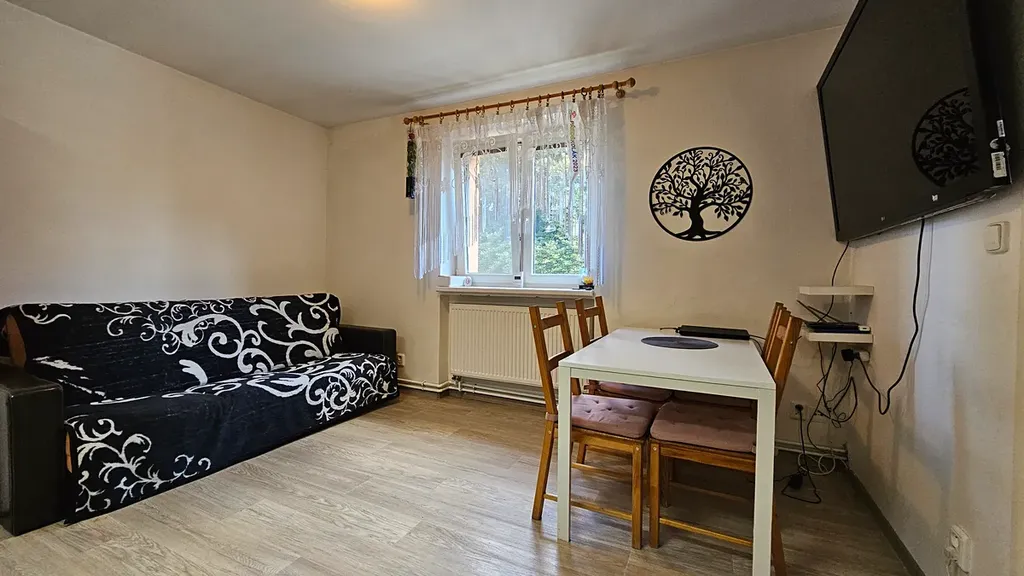 Dispozice zahrnuje vstupní chodbu, ložnici, dětský pokoj, kuchyň s obývacím koutem, koupelnu a samostatné WC.