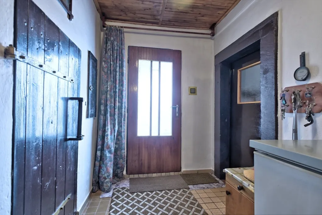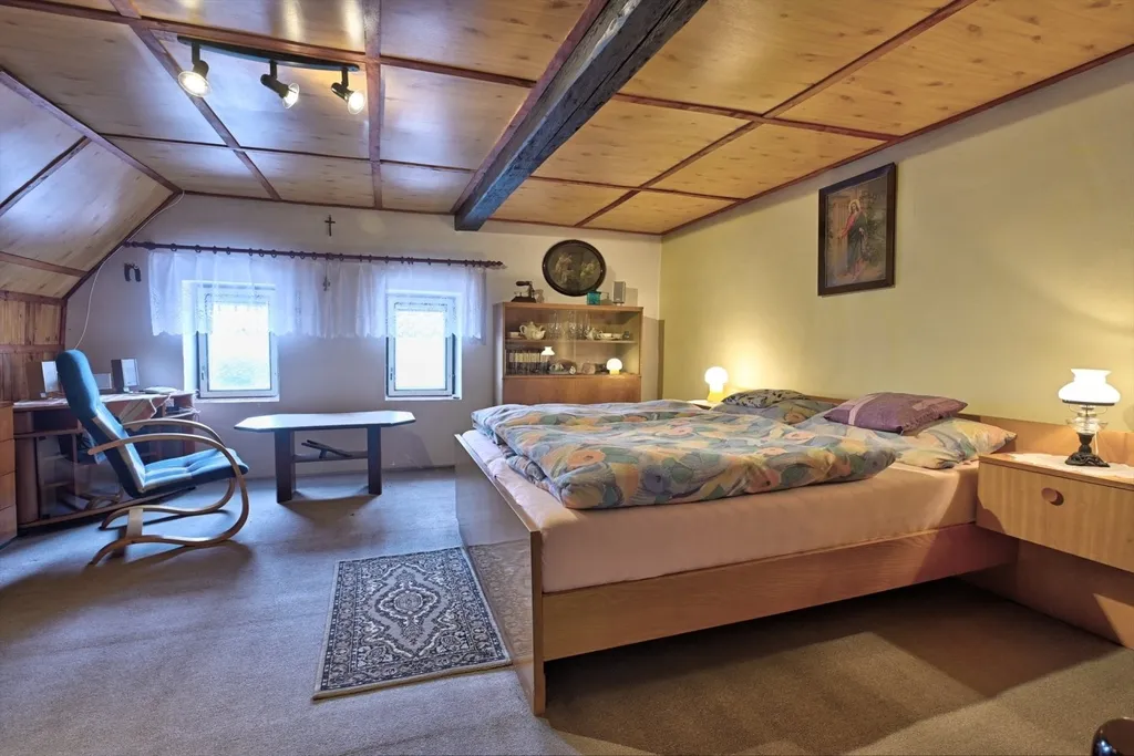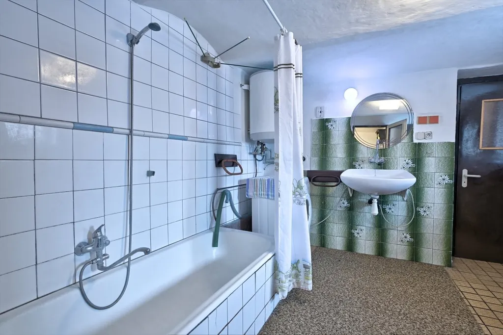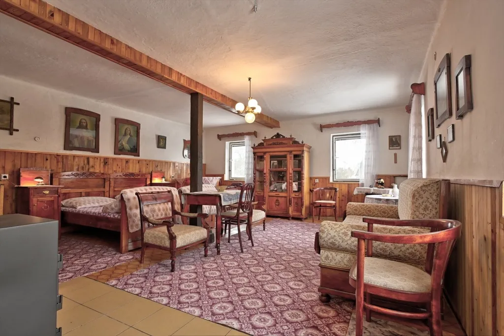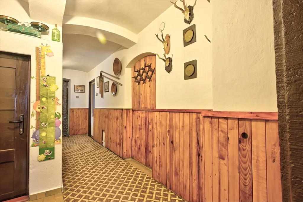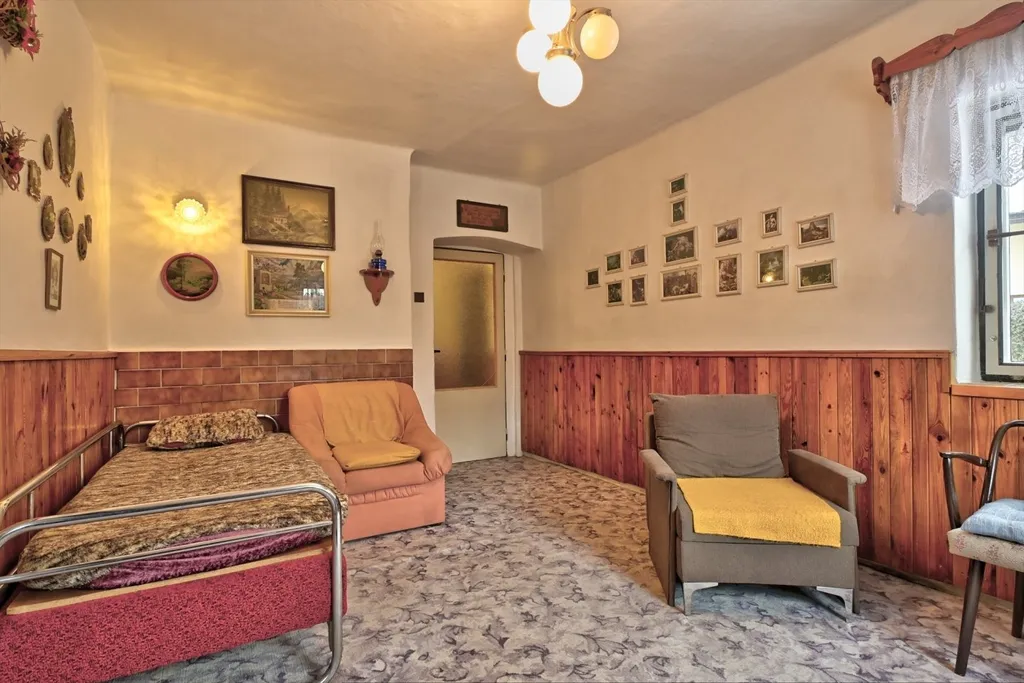 Nabízíme rodinný dům v obci Dolní Kalná v části Slemeno. Zděný dům s původními prvky obytné a hospodářské části má zachované klenuté stropy a kamenná ostění. V podkroví je jedna obytná místnost a rozsáhlé prostory pro úpravy a využití dle představ nového vlastníka. V přízemí je prostorná ložnice a obývací pokoj s částečně oddělenou kuchyní. Na konci chodby je vstup do spižírny, do koupelny s odděleným WC a do malého sklepa. K obytnému domu navazuje garáž s dílnou a zastřešením pro dřevo. Dům je obklopený rovinatým pozemkem. Je napojen na vodovodní řád a septik. Vytápění je zajištěno lokálními kamny či elektrickými přímotopy, ohřev vody elektrickým bojlerem. Obchody a služby se nachází v nedalekém Hostinném 5 km a Vrchlabí vzdáleném 15 km. Momentálně je dům využívaný pro rekreaci. Jeho umístění lze považovat za strategické místo pro dojezd do zimních středisek i spoustu příležitostí letních výletů po okolí - ZOO, přehrada Les Království, hrad Pecka, větrný mlýn a další zajímavá místa.