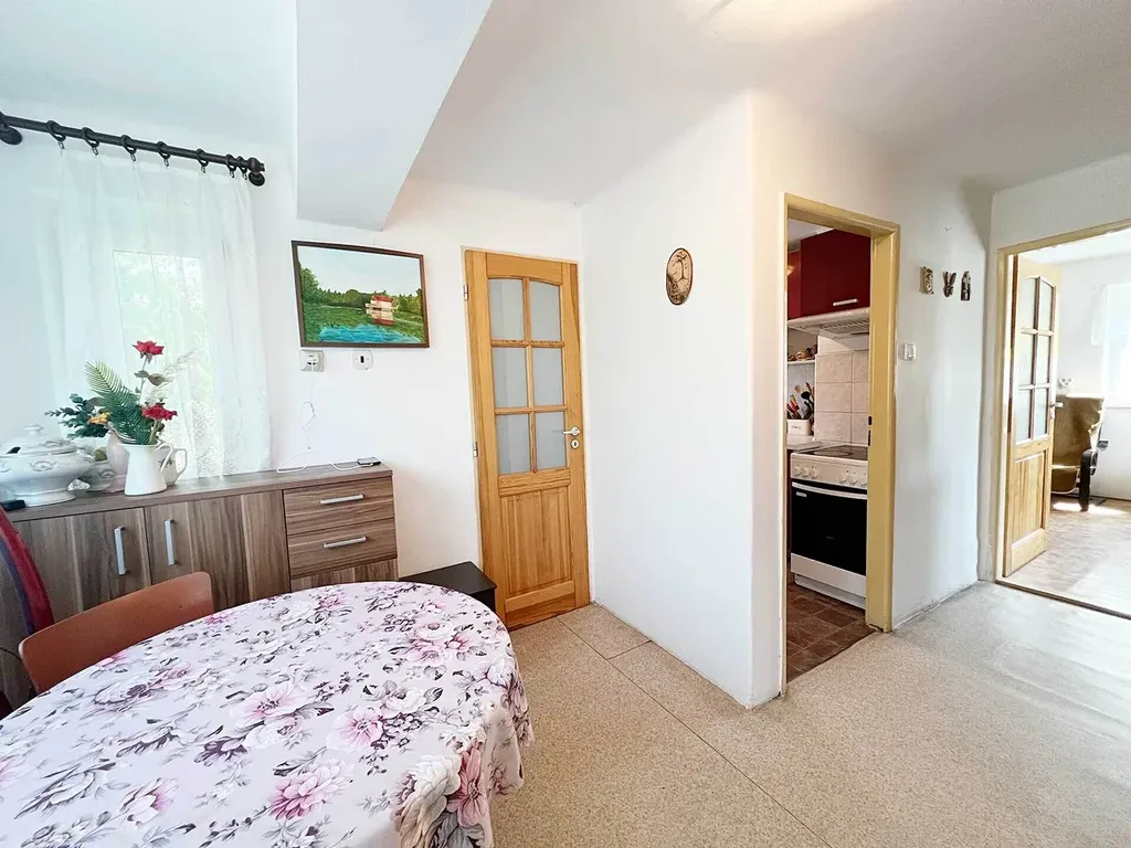 Dům má 2 nadzemní podlaží o celkové rozloze 65m², sklep, garáž, samostaný skleník a dřevník v zadní části pozemku. V přízemí se nachází předsíň, zděná veranda, obývací pokoj, malá ložnice, kuchyň s komorou, wc a vstup do sklepa. V podkroví naleznete dvě samostatné ložnice. Koupelna se nachází za garáží a vstupuje se do ní ze zahrady. V suterénu domu je sklep s menší dílnou a regály na potraviny. Garáž je přistavěna k boční straně domu a šlo by na ní postavit další patro a zvětšit tak dispozici stavby až o 20m². V zahradě jsou okrasné dřeviny a keře, skleník a za domem dřevník. Dům je zděný, je vytápěn kamny na tuhá paliva, má vlastní studnu a odpad je řešen jímkou.