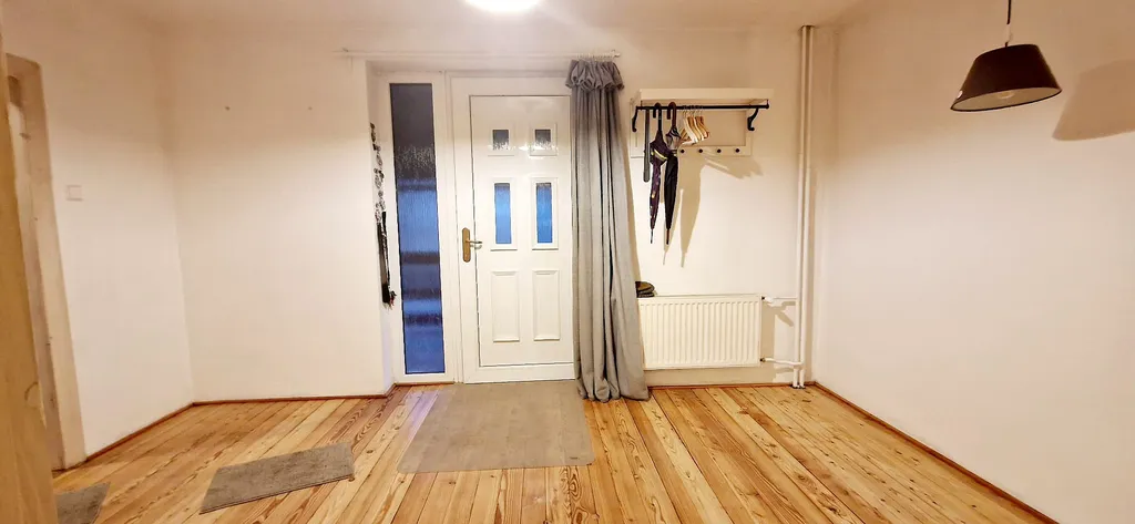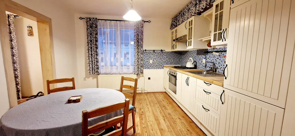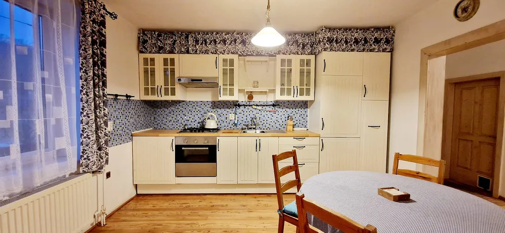 Disponuje předsíni, obývacím pokojem, prostornou kuchyní s kuchyňskou linkou se zabudovanými spotřebiči.