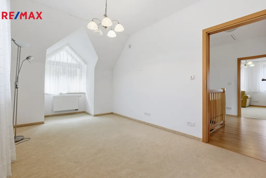 V patře jsou dvě útulné ložnice, koupelna s vanou a samostatné WC.