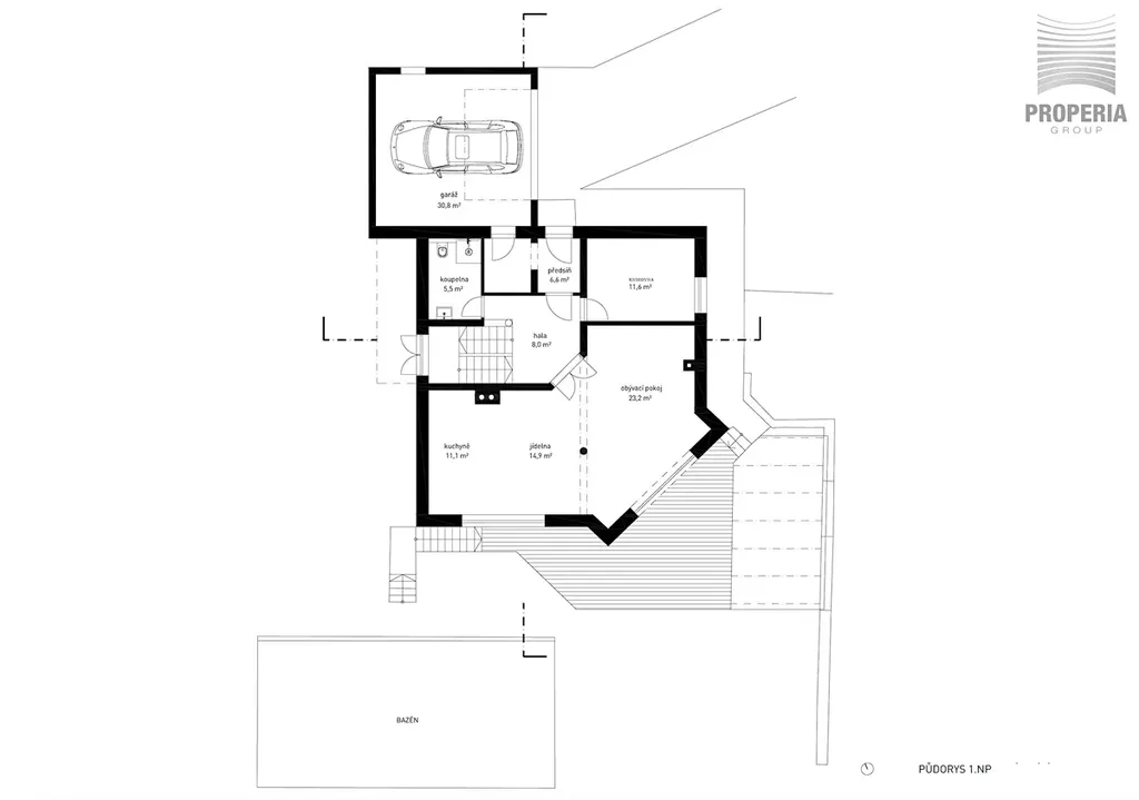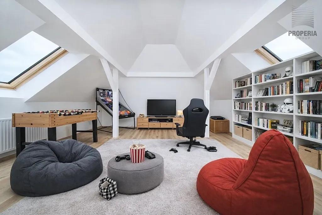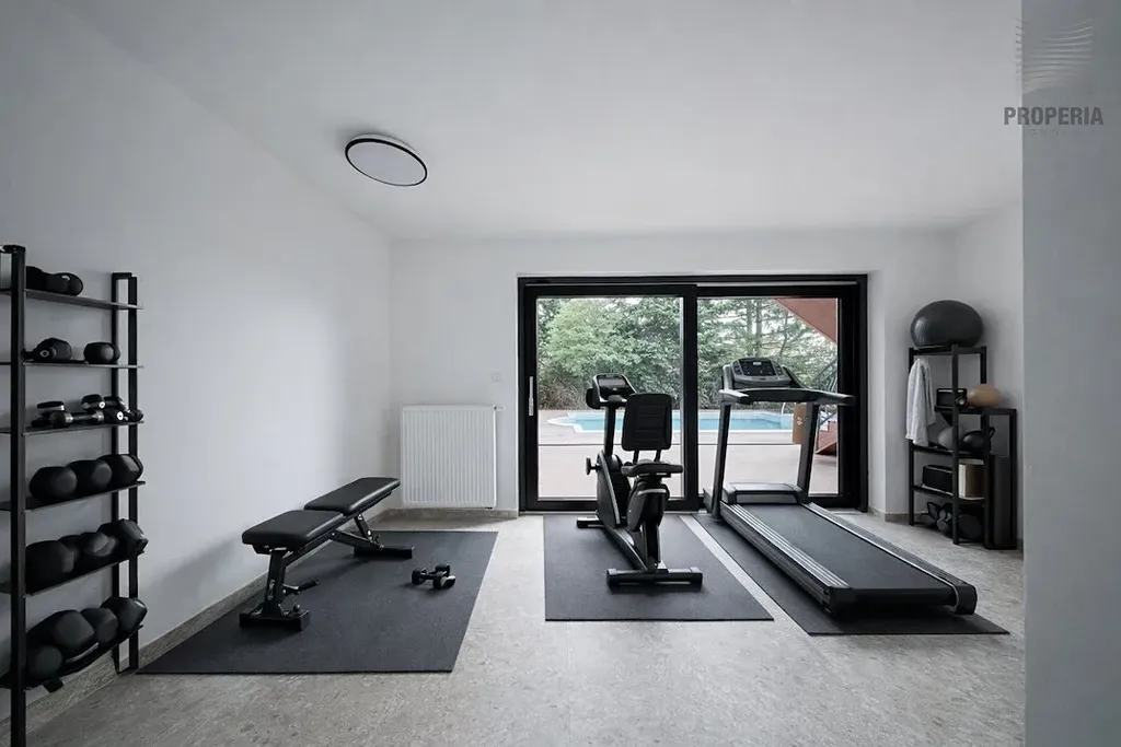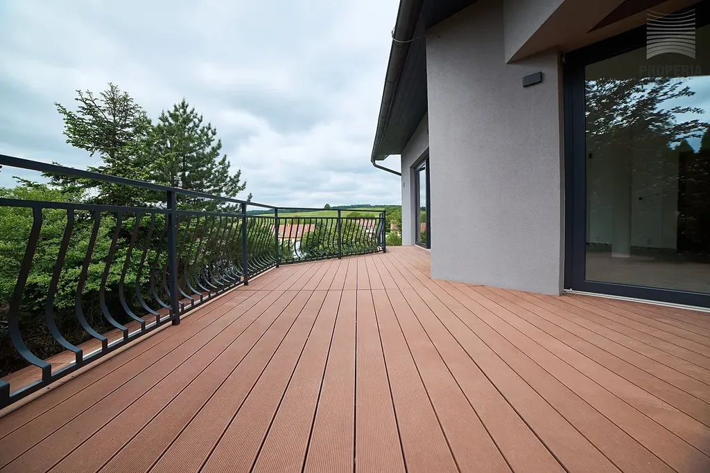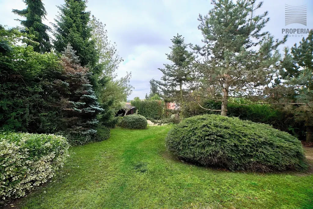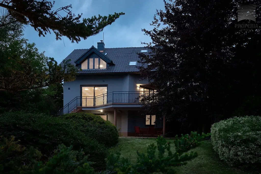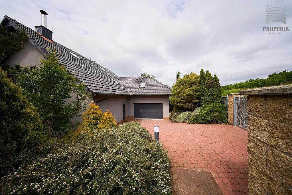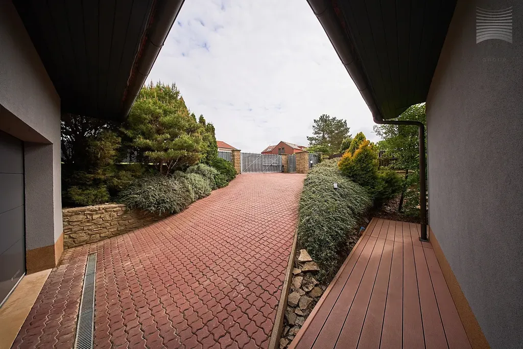 Velkorysá terasa s bazénem, zastřešeným posezením a zahradním domkem s dalším posezením. Garáž pro dvě auta, sklep a promyšlené dispoziční třípatrové řešení.