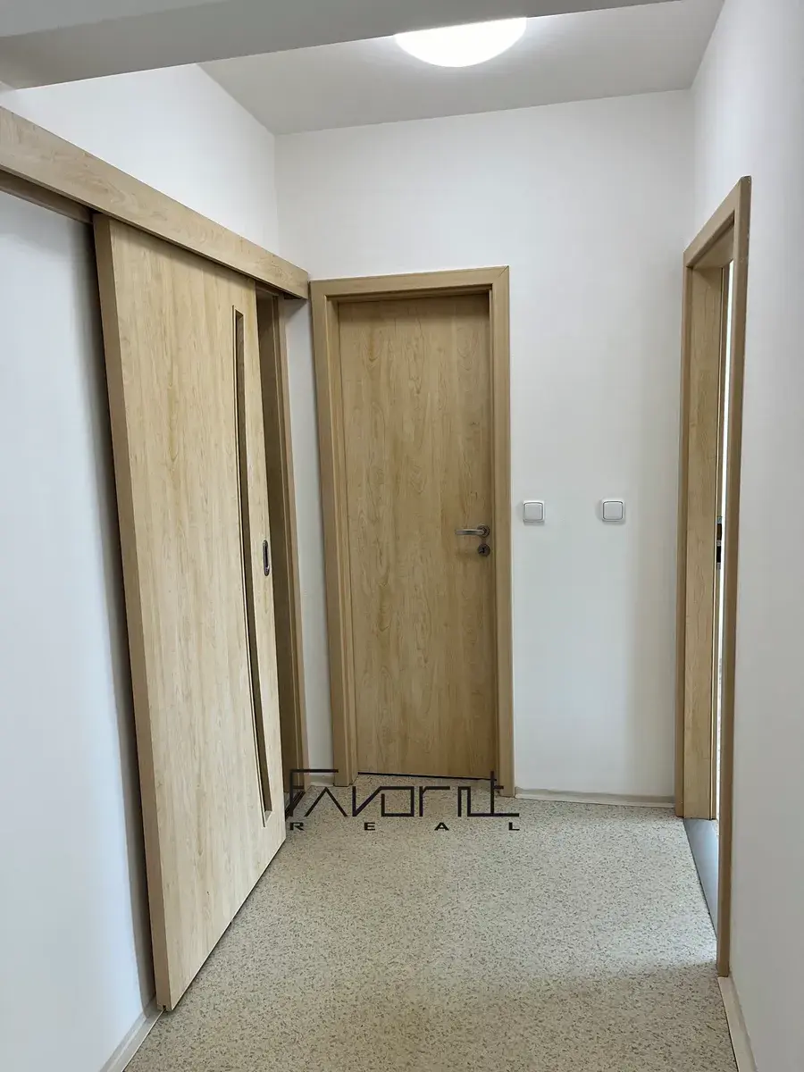 Světlá vinylová podlaha, dvě stropní svítidla, posuvné dveře do obývacího pokoje a další interiérové dveře v jednotném laminátovém provedení včetně zárubní. Bezpečnostní vstupní dveře.