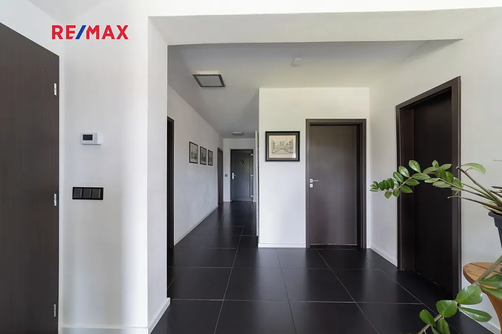 V přízemí domu je samostatná bytová jednotka 1kk včetně koupelny a samostatného wc. Dále je zde prostorná dvougaráž, dílna, sklad na sportovní potřeby a technická místnost, ve které se mimo jiné nachází řídící jednotka fotovoltaické elektrárny umístěné na střeše domu s výkonem 20 kw. Ve druhém a třetím podlaží se nachází opravdu nadstandardně řešený byt 7kk. Při vstupu do tohoto bytu máme hned v prostoru zádveří pracovnu a šatnu, dále se pak otvírá obrovský prostor, který propojuje kuchyň s varným ostrůvkem, jídelnu a obývací pokoj, který je otevřený do galerie do dalšího podlaží. Na tomto patře se dále nachází master bedroom s privátní koupelnou a také samostatná toaleta pro návštěvy. Po vzdušném a světlém schodišti vystoupáme do horního podlaží, kde se nachází soukromá zóna majitelů, kde máme k dispozici krom již zmíněné prostorné koupelny s vanou a sprchovým koutem také další šatnu a 4 pokoje. V tomto podlaží mají téměř všechny pokoje včetně koupelny přes francouzská okna přístup na balkóny, obepínající celou jihozápadní stranu domu.