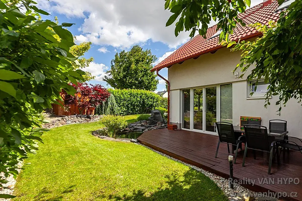 Vybavení bytu zahrnuje, kvalitní vinylové podlahy/plovoucí podlahy, dlažbu a obklady, interiérové dveře CAG, kuchyň včetně vestavěného nábytku citlivě řešeného na míru pro tento byt, k dispozici je také v obývacím pokoji nyní nevyužívaný komín pro instalaci krbových kamen, optický internet aj. Teplo a teplou vodu dodává plynový kondenzační kotel, v koupelně je instalováno el. podlahové topení. Velice příjemná je zahrada se závlahou, která byla navržena zahradním architektem a nabízí klidné posezení, místo na hry a odpočinek u zahradního jezírka.