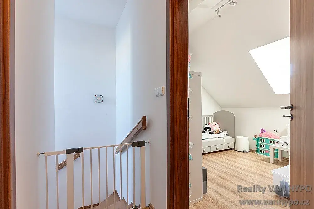 Dispozice moderně řešeného bytu nabízí novému majiteli v 1. NP prostornou vstupní chodbu, světlý obývací pokoj s možností instalace krbových kamen a s pohodlným vstupem na předzahrádku, kompletně vybavenou kuchyň se spotřebiči TEKA, šatnu, technickou místnost se vstupem na zahradu a samostatnou toaletu s umyvadlem. Ve 2.NP jsou pak k dispozici 3 pokoje, koupelna s vanou a toaletou.