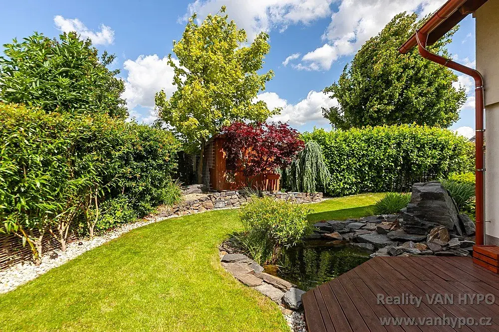 Světlý, nadstandardně řešený mezonetový byt 4 + kk s udržovanou předzahrádkou (150 m2), zahradním jezírkem, parkovacím stáním a praktickou dispozicí v klidné zástavbě rodinných domů.
