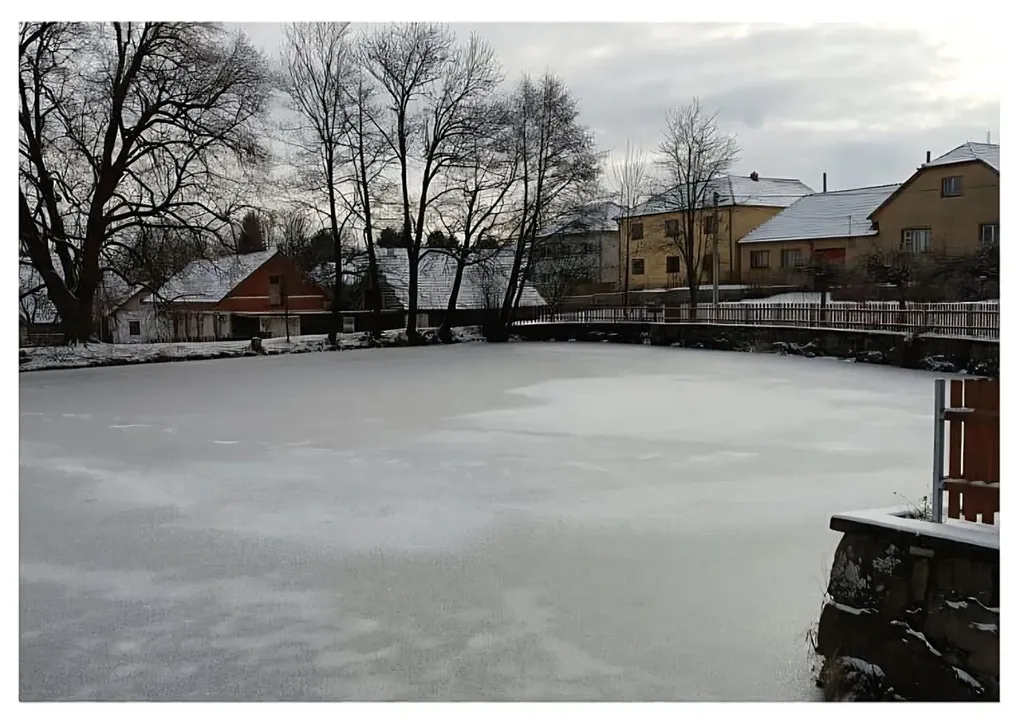 Celý pozemek je oplocený, příjezd je po obecním pozemku k vratům.