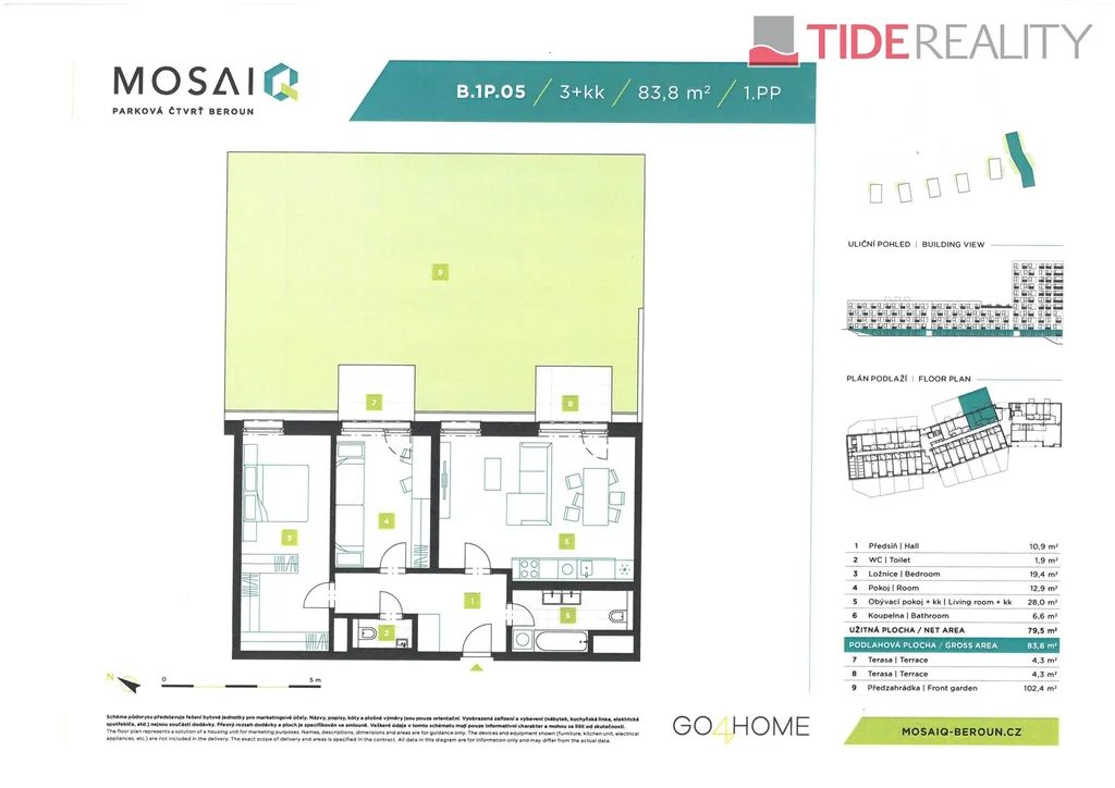 Byt 3+kk (84 m2) s terasou a předzahrádkou 111 m2 – každodenní relax pod širým nebem v novostavbě MOSAIQ Beroun, ul. Na Máchovně. Tento jedinečný byt 3+kk se nachází v novém rezidenčním projektu MOSAIQ Beroun. Byt nabízí moderní obytný prostor s praktickým uspořádáním – dominantou je obývací pokoj propojený s kuchyňským koutem, odkud se vstupuje přímo na zahradu. Druhý pokoj, klidná ložnice, rovněž disponuje přímým vstupem na terasu a do zahrady. Dispozici doplňuje další ložnice, či pracovna a prostorná, téměř 7 m2 velká, koupelna s toaletou, navíc ještě samostané WC s umývátkem a vstupní hala s dostatkem místa pro šatní skříň. Celý byt působí vzdušně a díky dvěma vstupům na zahradu nabízí neobvyklý komfort pro každodenní život. Podlahová plocha činí příjemných 84 m² + terasy a předzahrádka s celkovou plochou 111 m². Byt je situovaný v budově B. Standardní vybavení jednotky zahrnuje plovoucí podlahy, interiérové dveře s výškou 210 cm, moderní vybavení koupelen, okna s barevným rámem a izolačním trojsklem, přípravu na vnější žaluzie. V bytech budou moderní datové rozvody formou strukturované kabeláže a přípojka STA. V projektu bude využita smart technologie pro vytápění, která pracuje se dvěma tepelnými zdroji – tepelnými čerpadly a zemním plynem. Dostatečná kapacita parkovacích míst převážně v podzemních garážích, ale i venku. Doplatek kupní ceny ve výši 85% je hrazen až po kolaudaci (2027).