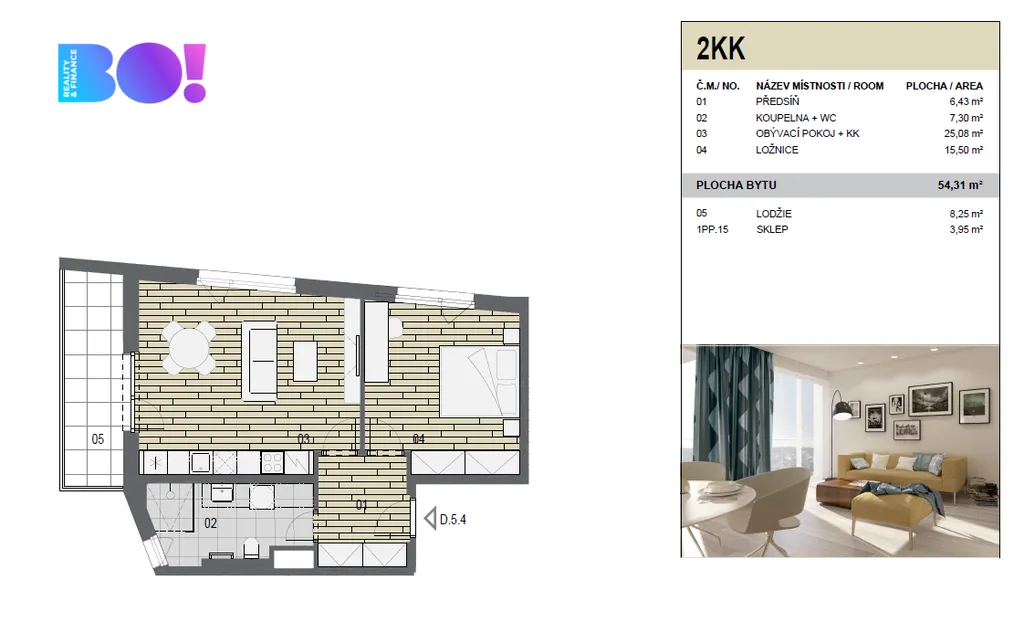Byt o podlahové ploše 54 m² s lodžií 8 m² je šikovně dispozičně řešen tak, aby nabízel dostatek prostoru pro komfortní život.