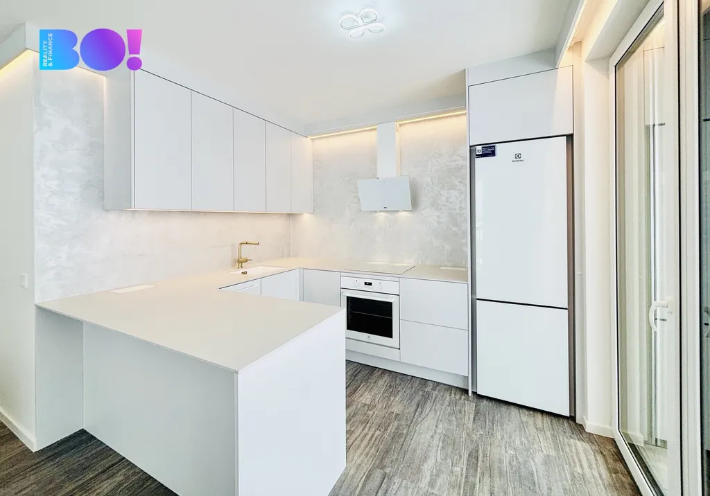 Byt je nabízen s plně vybavenou kuchyní včetně moderních spotřebičů: lednice s mrazákem, mikrovlnné trouby, elektrické trouby, varné desky, myčky nádobí a digestoře. Součástí je také jídelní stůl a židle.