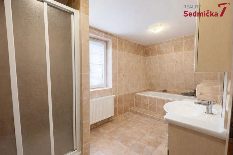 Součástí patra je velká koupelna s toaletou, vanou i sprchovým koutem. Z haly pokračuje schodiště do podkroví.