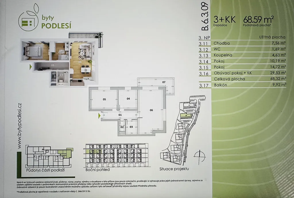 Dlouhodobý pronájem zcela nového bytu 3+kk (69 m²) s velikým rohovým balkonem ve 3. nadzemním podlaží bytového domu B6 – kolaudace proběhne v tomto měsíci. Samostatná garáž velikosti 17 m² se vstupem přímo k výtahu zahrnuta v ceně nájmu. Praktická rodinná dispozice - obývací pokoj (30 m²) s moderní kuchyňskou linkou v bílo-šedém designu, dvě neprůchozí ložnice (10 a 15 m²), koupelna s vanou, WC zcela odděleno, vstupní hala 8 m². K dispozici je bezpečná a prostorná sklepní koje nadstandardní velikosti 7,83 m² včetně garáže pro 1 osobní auto přímo v domě. Součástí výstavby bude dokonalá parková úprava rezidenčního bytového komplexu – nově přiznaný tok potoka s lávkami, malý biotop, vybudovaná cyklostezka, bike park, gril pointy, dětské hřiště s prvky venkovní posilovny.