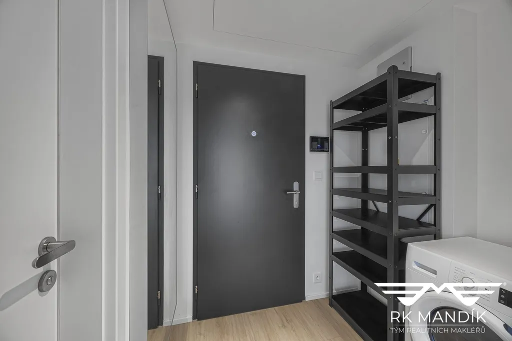 Byt tvoří obývací část s moderní vestavěnou kuchyňskou linkou, zádveří s praktickým prostorem pro pračku a koupelna se sprchovým koutem a toaletou. Interiér je kompletně zařízený a připravený k okamžitému nastěhování.