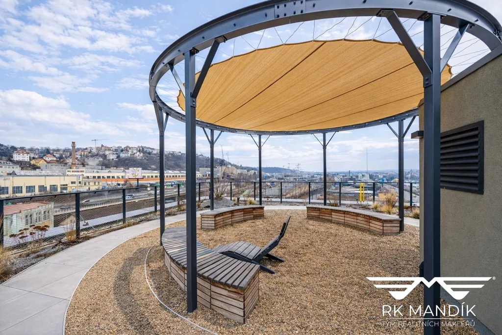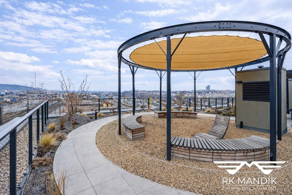 Zelená střecha s relaxačními zónami a výhledem na Vyšehrad.