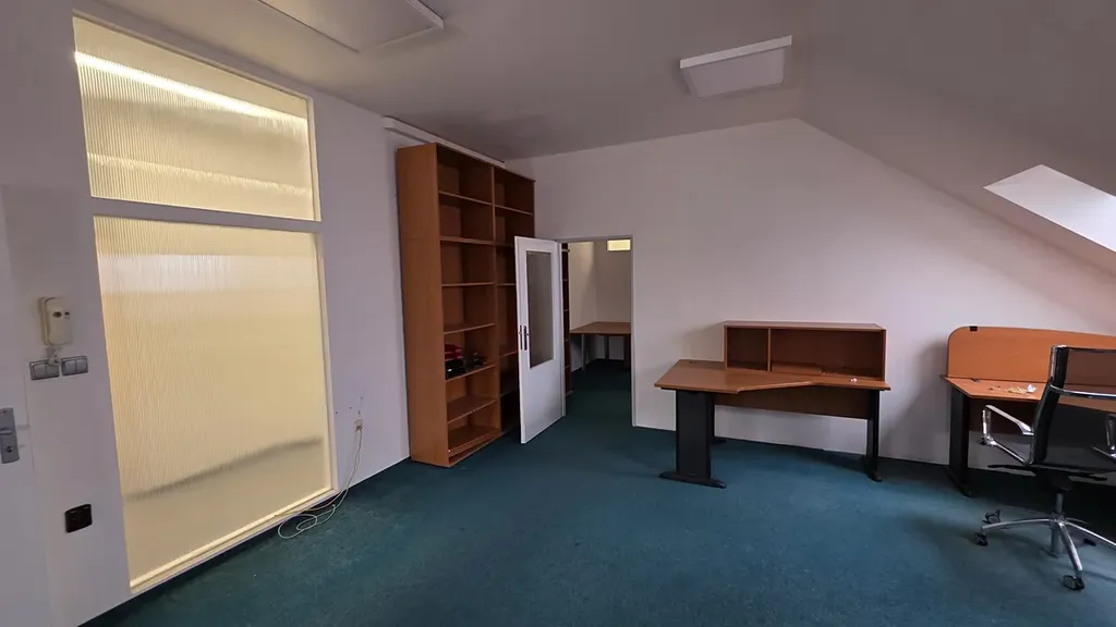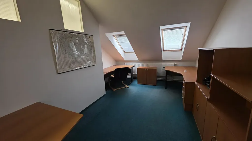 - Nad prvním patrem naleznete nadstavbu s částečně šikmými stěnami. Tento prostor byl užíván jako kancelář či zasedací místnost, je dostatečně prosvětlen střešními okny a přístupný po točitém schodišti.