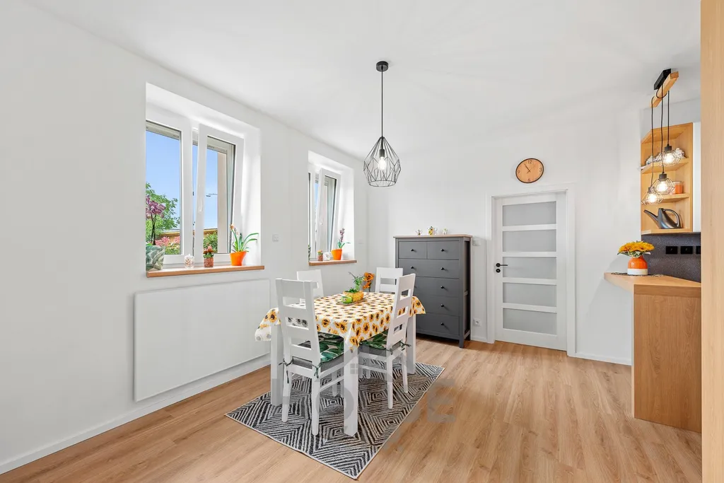 Byt o podlahové ploše 108 m² je situován v 1. nadzemním podlaží udržovaného domu. Dispozice zahrnuje tři samostatné pokoje, samostatnou kuchyni s jídelním koutem, koupelnu, komoru a dostatek úložných prostor. Kuchyň je vybavena moderní kuchyňskou linkou s vestavěnými spotřebiči značky Gorenje a tvoří praktické centrum celé domácnosti.