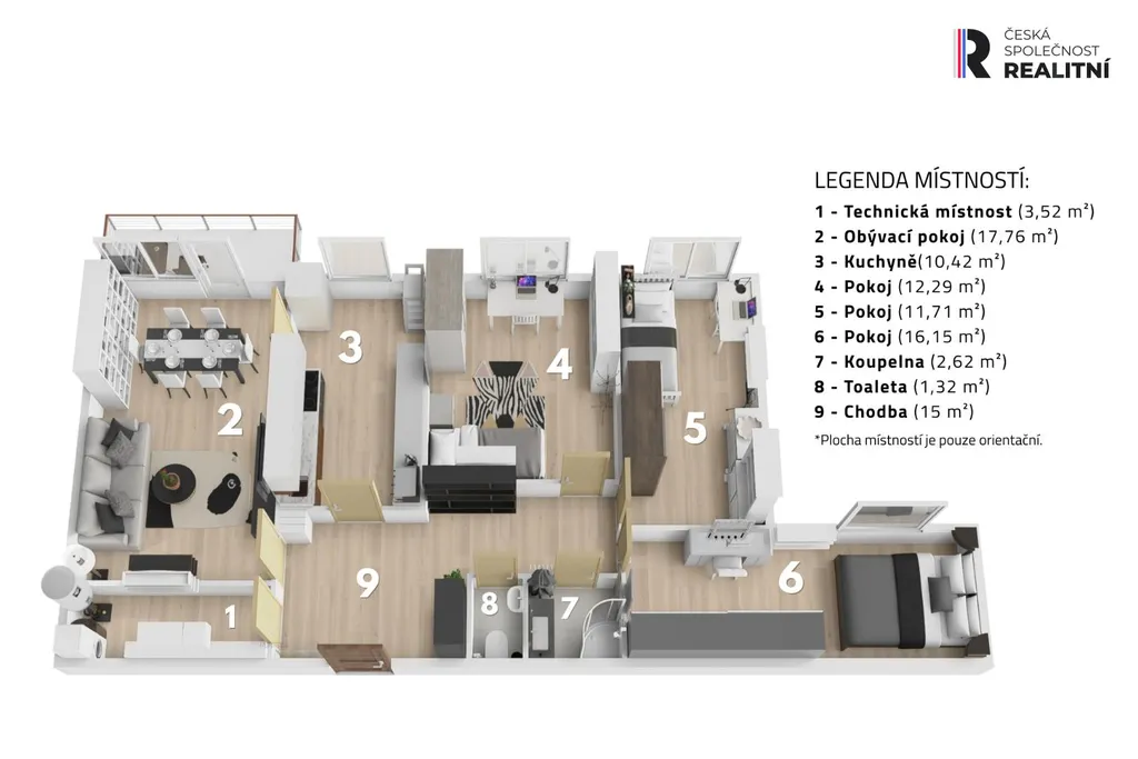 Samotný byt se nachází ve 4.NP a je za dalšími uzamčenými dveřmi. Na patře jsou pouze 4 byty. Dispozice bytu 4+1 je velmi praktická a s úžasnou výměrou 89 m² + lodžie 3 m² + sklep 1,5 m². Je to přesně to, co dnešní rodiny hledají — a přitom na trhu téměř není. V bytě je navíc praktická velká komora, kde si můžete udělat dílnu nebo sklad.