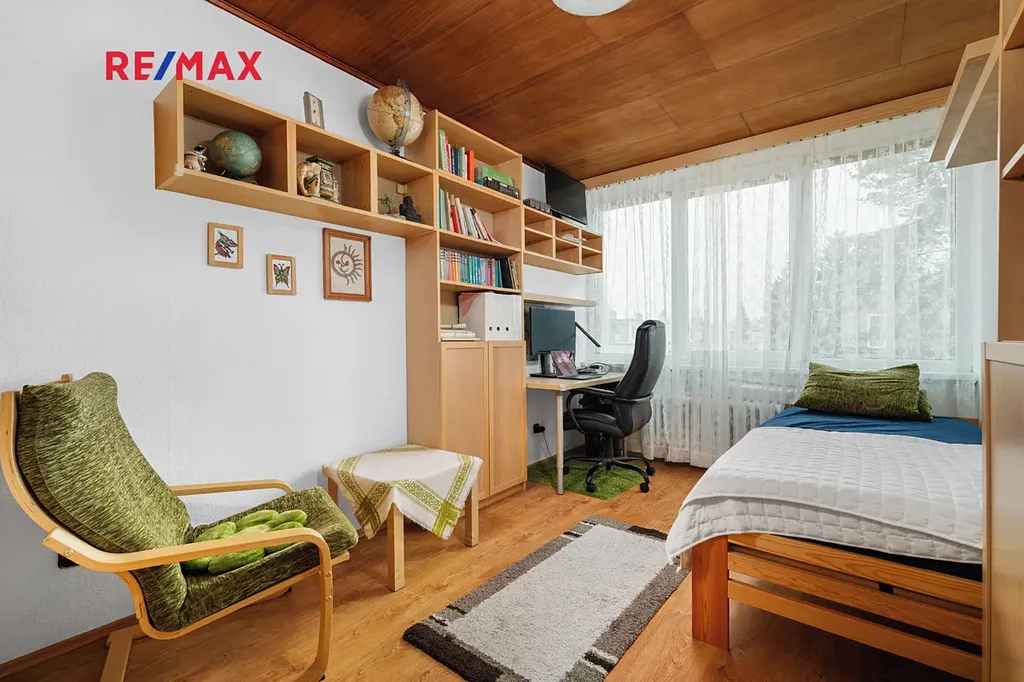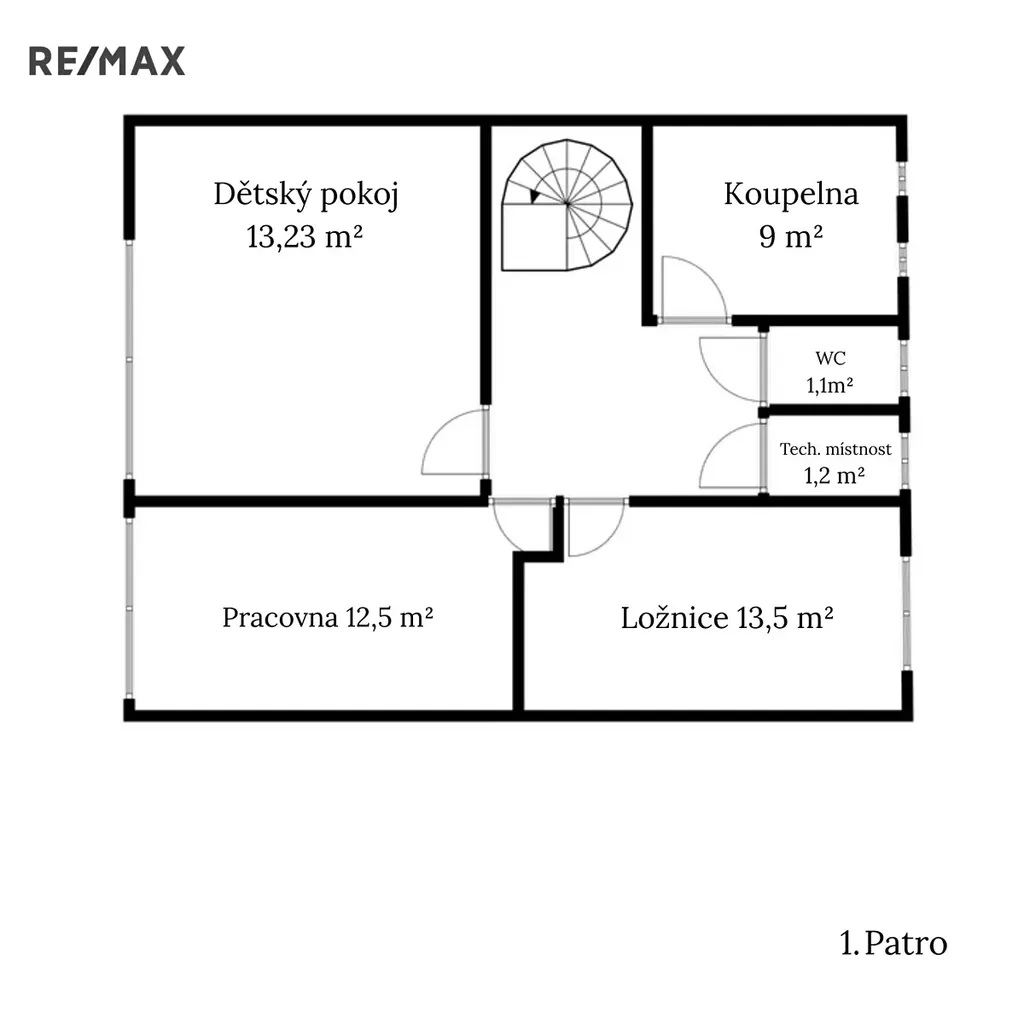 V patře najdete pracovnu (12,5 m²), ložnici (13,5 m²), dětský pokoj (13,1 m²) a prostornou koupelnu (9 m²) se dvěma umyvadly, vanou i sprchovým koutem. Samostatné WC je v přízemí i v patře.