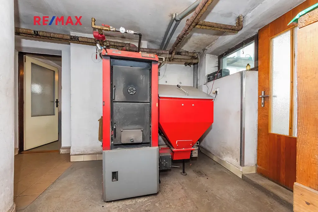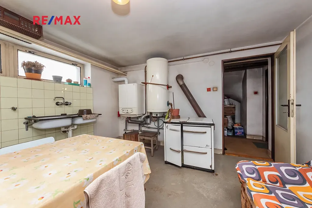 Suterén (80 m2): chodba a 6 místností – černá kuchyně, kotelna, sklad uhlí a další skladové prostory.