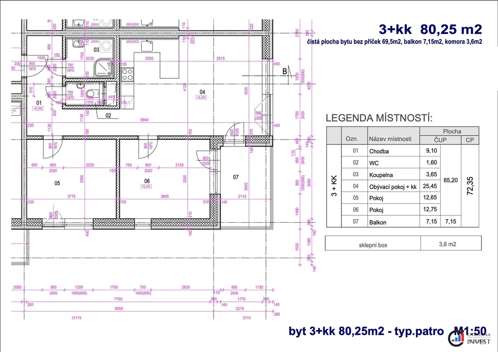 Byt se nachází ve 3. nadzemním podlaží domu s výtahem a nabízí celkovou plochu 69,5 m², k tomu lodžii o výměře 7,15 m² a sklepní kóji 3,6 m². Velkým benefitem jsou dvě parkovací stání přímo u domu, která jsou součástí prodeje.