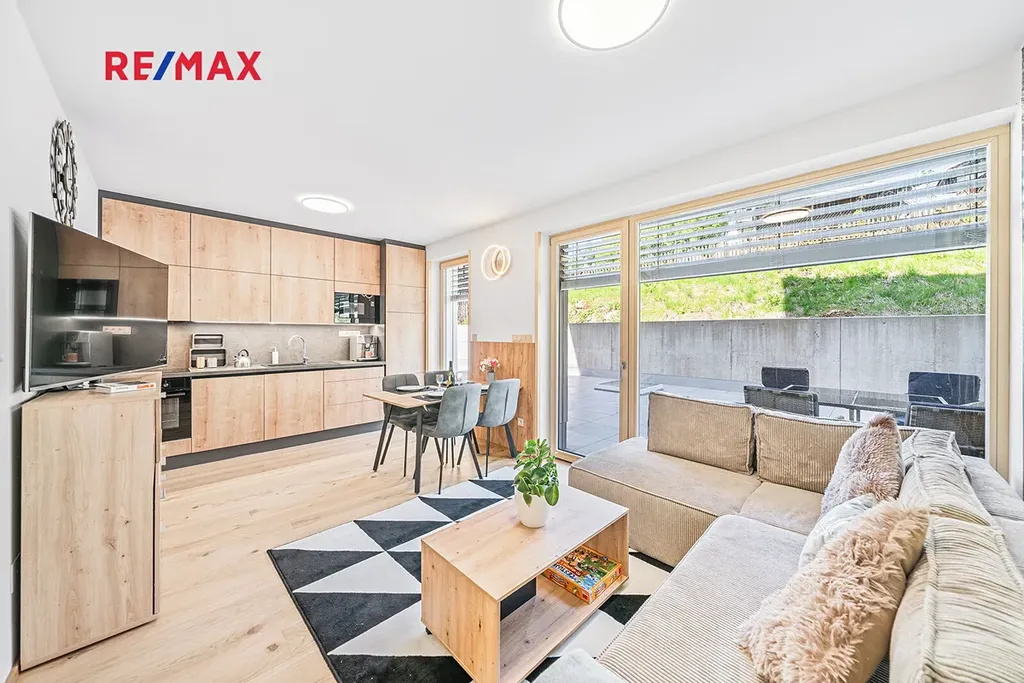 Srdcem apartmánu je obývací pokoj s kuchyňským koutem a plně vybavenou kuchyňskou linkou, který je francouzským oknem propojen s velkorysou terasou o velikosti 76 m2.