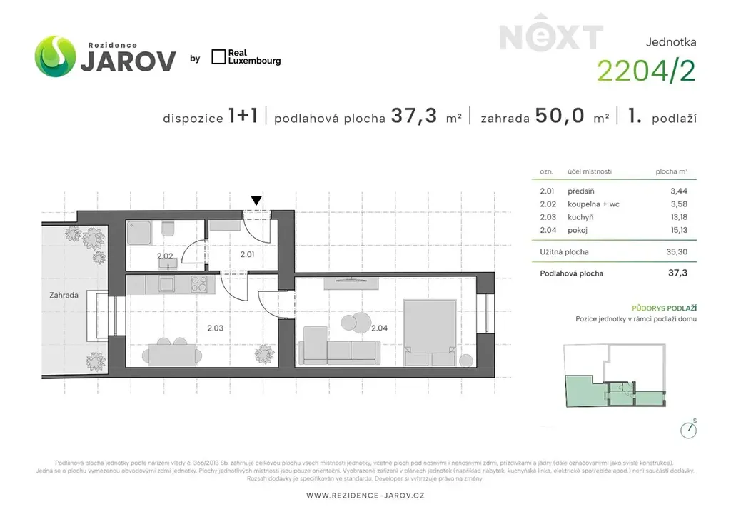 Byt má podlahovou plochu 37,3 m2 a zahrádku (50 m2) s terasou ve vnitrobloku domu, která je obrovským bonusem této nemovitosti.