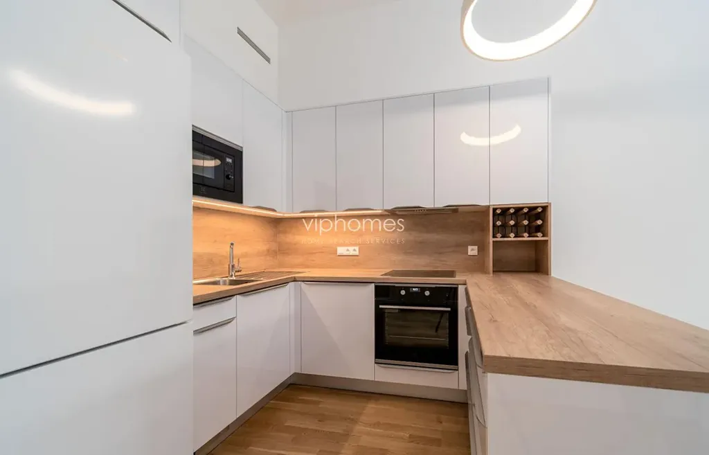 Kuchyň je vybavena indukční varnou deskou,troubou,myčkou nádobí, mikrovlnnou troubou a lednicí Liebherr s mrazákem.