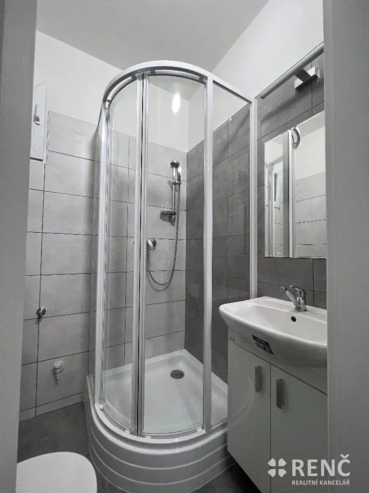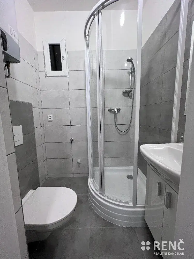 Koupelna je vybavena sprchovým koutem, umyvadlem, přípojkou na pračku a toaletou.