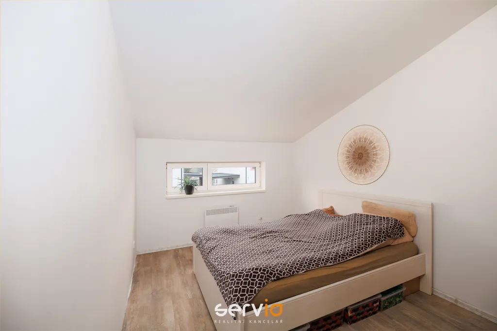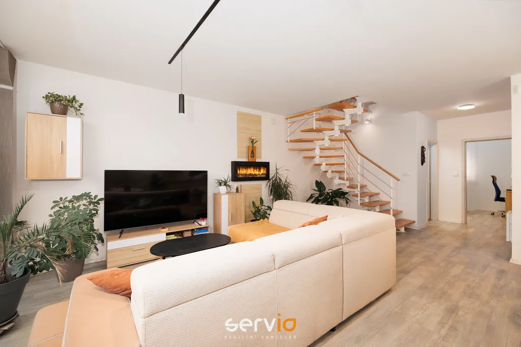 Jedná se o patrový dům o 2.NP v blokové zástavbě rodinných domů mimo hlavní ulici. V přízemí se nachází obývací pokoj s kuchyňským koutem, vstupem na zahradu s terasou, pracovna a WC. V patře zbývající 4 pokoje a koupelna s vanou a WC. Možnost parkovaní na vlastním pozemku až pro 3 auta, z toho 1 kryté za uzamykatelnou bránou.