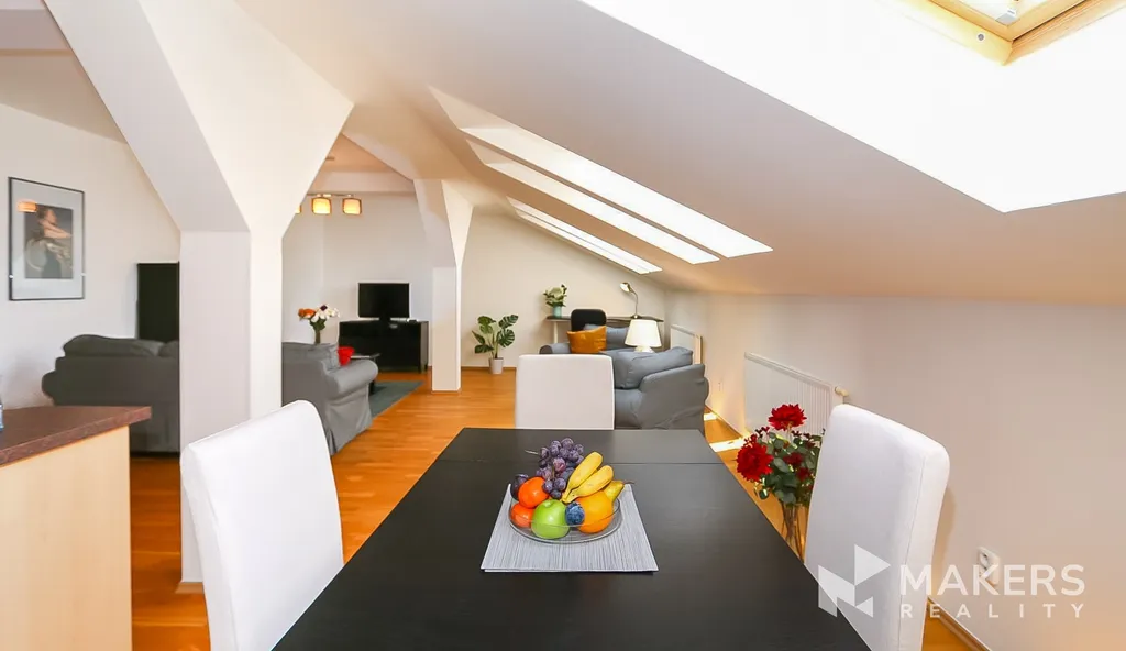 Nabízíme k dlouhodobému pronájmu krásný zařízení byt a velice útulný podkrovní byt 3+kk o celkové ploše 110 m2, který se nachází v 5. patře cihlového domu s výtahem v Sázavské ulici, Praha 2 - Vinohrady.