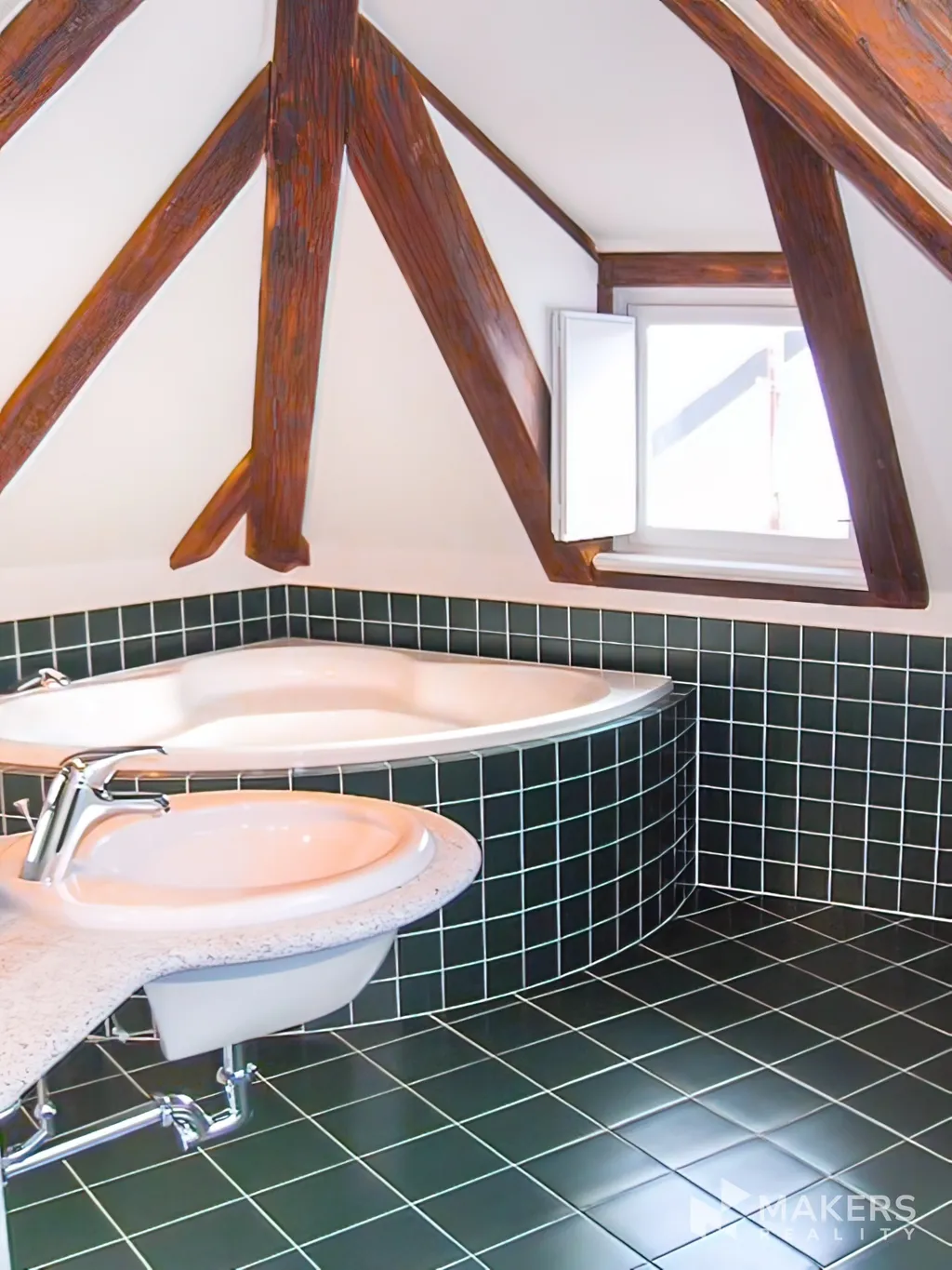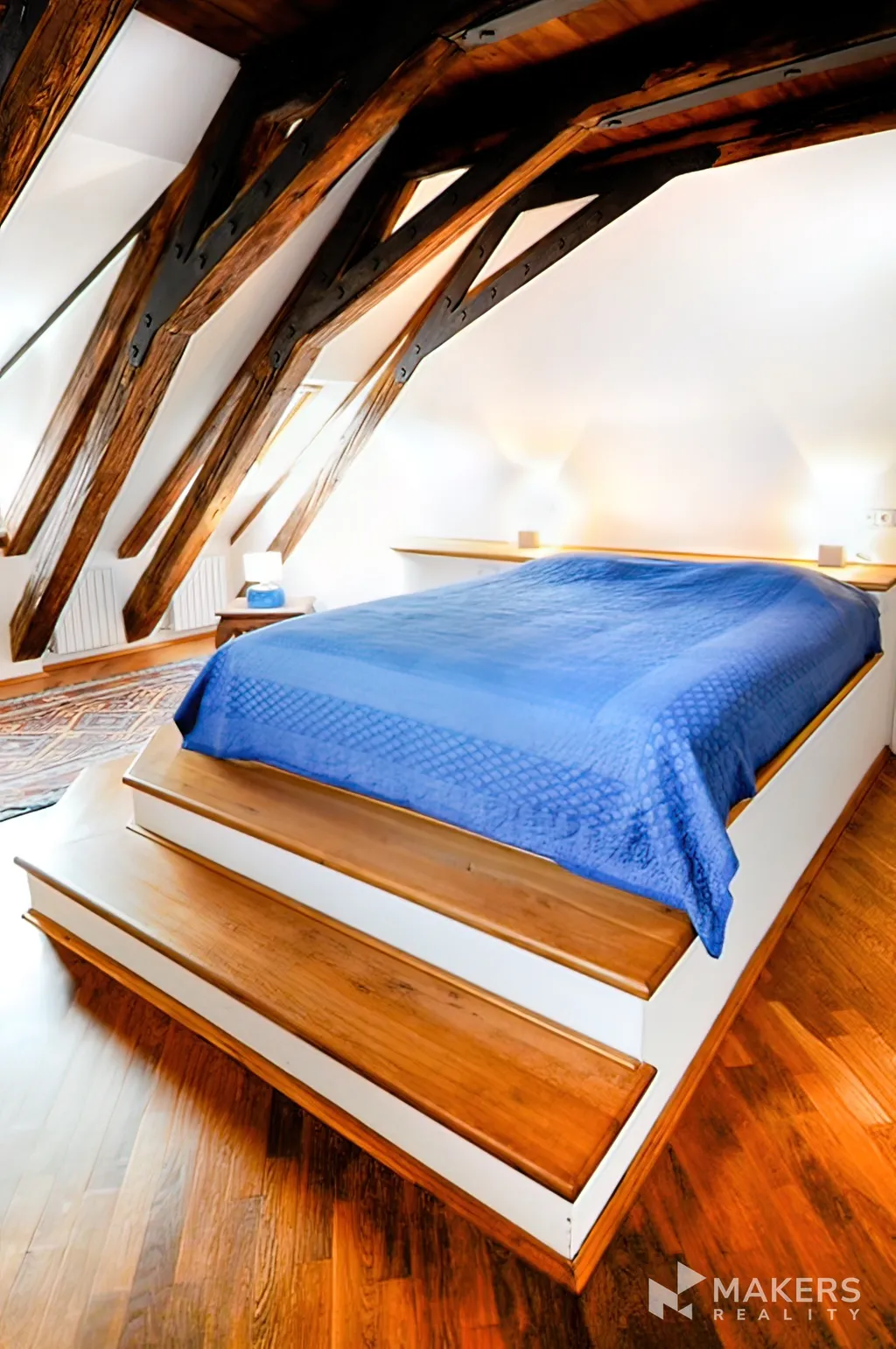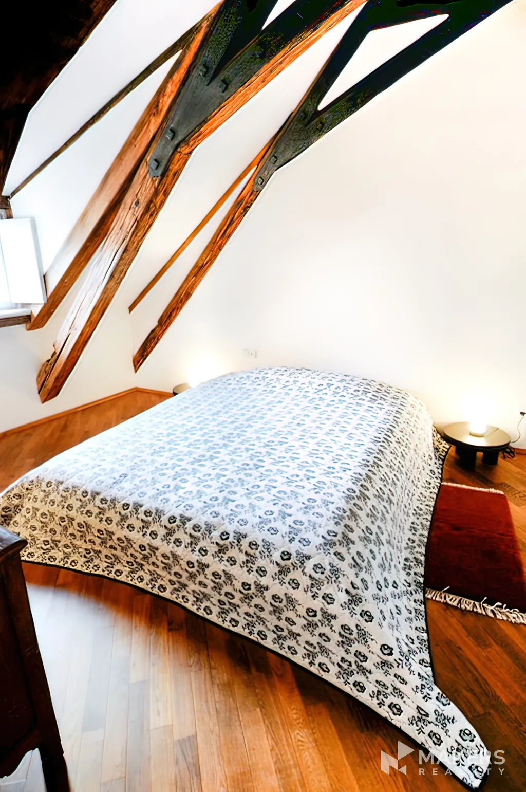 V horním podlaží bytu je ložnice s vestavěnými skříněmi, pracovním koutem a druhá koupelna (s rohovou vanou, umyvadlem, toaletou a bidetem).