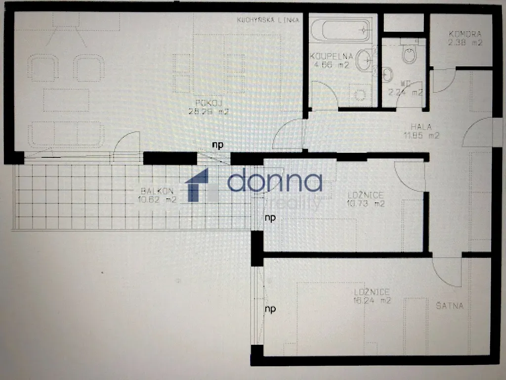 Obývací pokoj 25,28 m2 s kuchyňskou linkou, barovým pultíkem a včetně spotřebičů (myčka nádobí, lednice, varná deska, pečící trouba), vstup na balkon, 2 samostatné ložnice (10,73 m2 + 16,24 m2), koupelna s vanou, samostatná toaleta + přímo v bytě komora (2,38 m2).