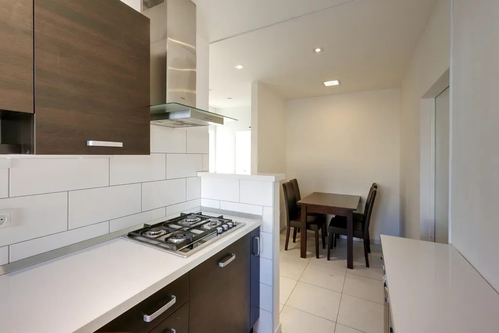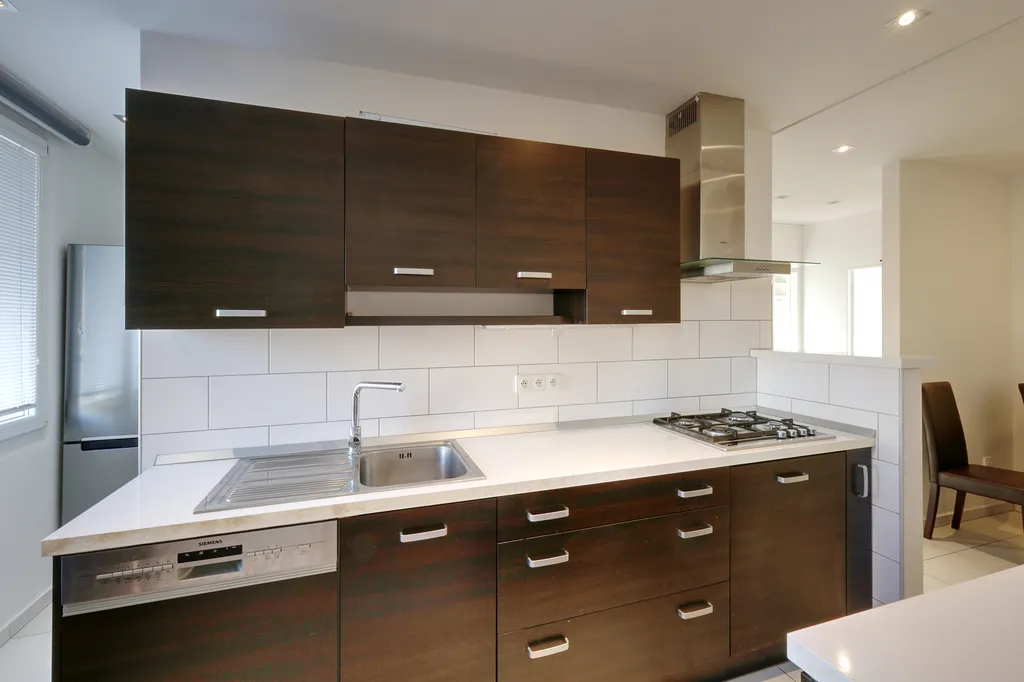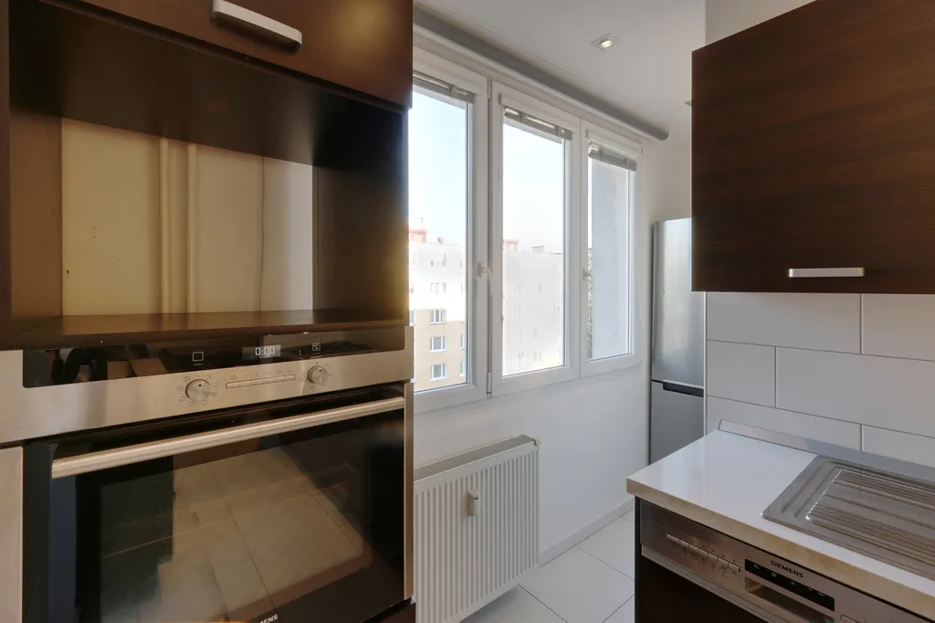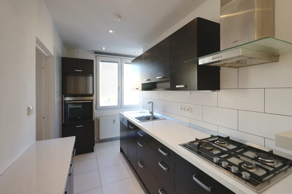 Součástí bytu je moderní kuchyňská linka, vybavená plynovou varnou deskou, digestoří, myčkou a vestavěnou troubou. V kuchyni je dále jídelní stůl se čtyřmi židlemi a lednice.