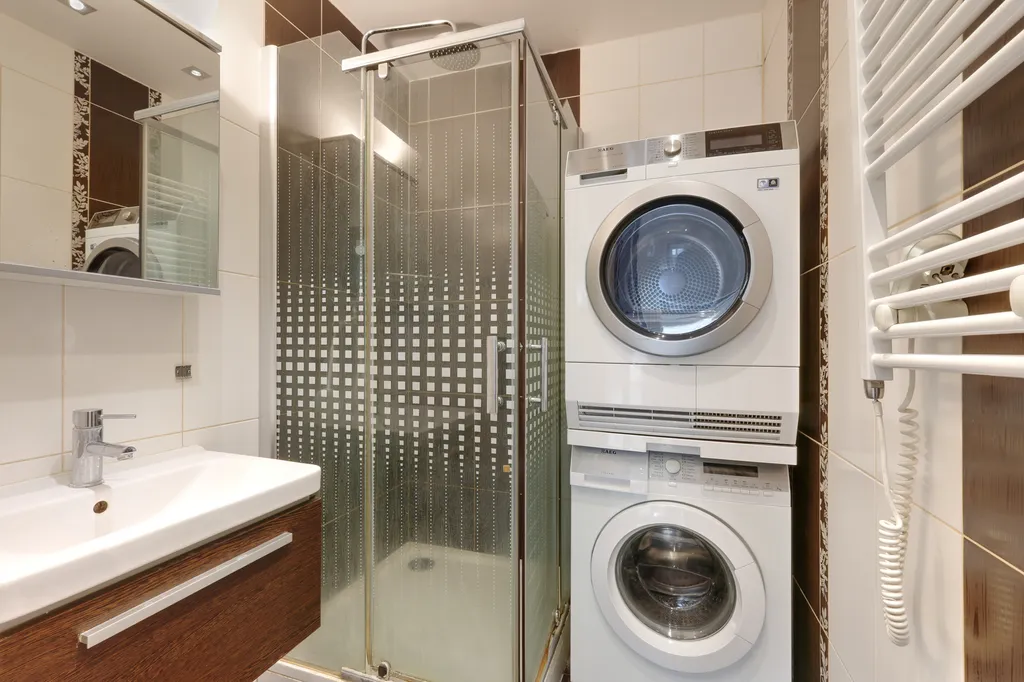 Koupelna je spojena s WC a vybavena sprchovým koutem, pračkou, sušičkou, topným žebříkem, umyvadlem s umyvadlovou skříňkou a zrcadlovou skříňkou. WC je závěsné.