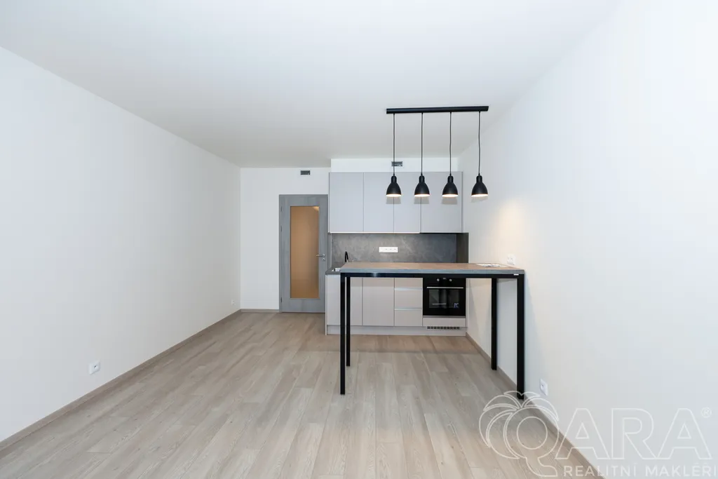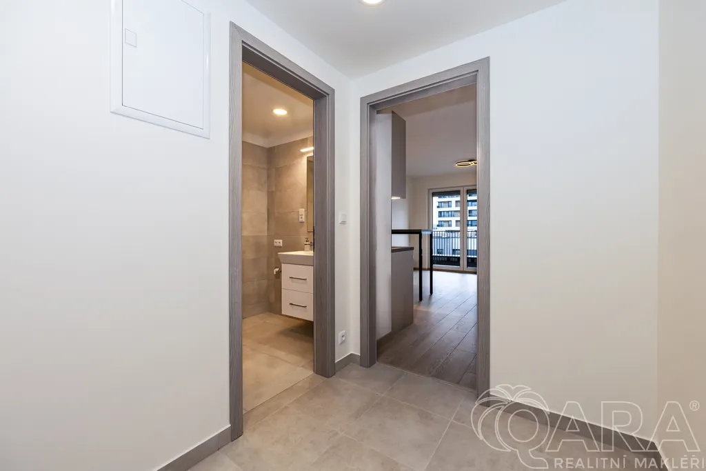 Byt je dispozičně členěn do vstupní chodby se šatní skříní, koupelny s toaletou, sprchovým koutem a pračkou, dále obytné místnosti s kuchyňskou linkou a vstupem do lodžie. Výhled z okna a vlastní lodžie orientovaná mimo rušnou silnici a tramvajovou trať. Součástí bytu je kuchyňská linka s jídelním stolem, robotický vysavač, modem pro připojení k internetu. Byt bude dovybaven velkou vestavnou skříní v předsíni a vestavnou lednicí a skříní v kuchyni. V ceně nájemného bytu je rovněž zahrnuta sklepní kóje v suterénu domu a kryté parkovací stání. Velmi nízké náklady (energetická náročnost B). Byt je vybaven rekuperací.