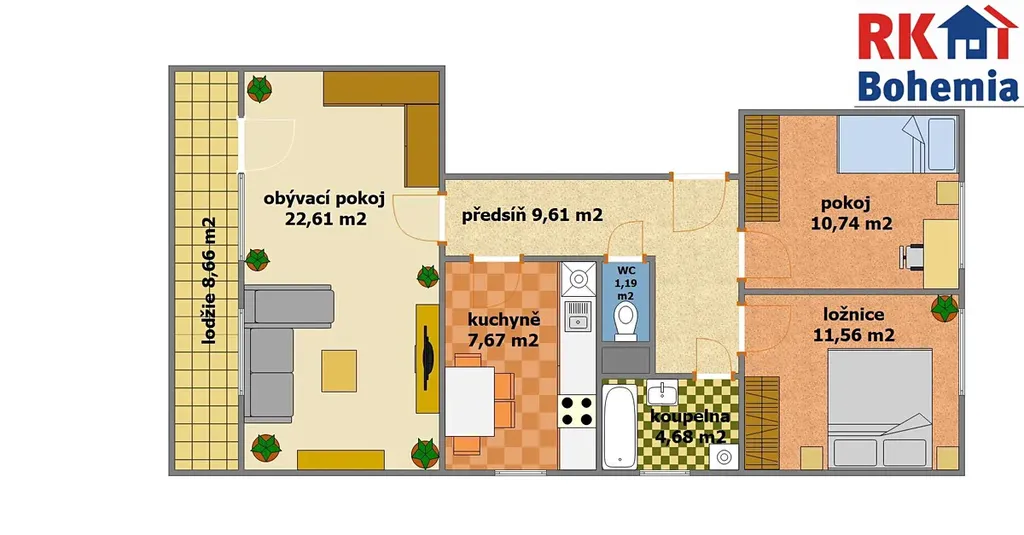 - Skladba místností: Obývací pokoj (22,61 m2), dva pokoje (11,56 m2 a 10,74 m2), samostatná kuchyně (7,67 m2), prostorná předsíň (9,61 m2), koupelna (4,68 m2) a samostatné WC (1,19 m2).