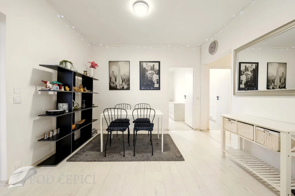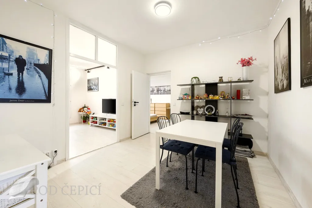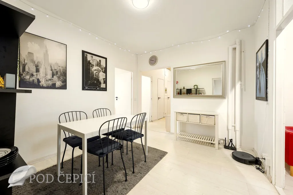 Dispozice bytu nabízí praktickou centrální místnost, která dnes slouží jako jídelna. Jelikož místnost nemá přímé osvětlení a větrání (okno), nemůže být jednotka označena jako 4+1. Současné uspořádání ale ukazuje, že i přes tento handicap může být prostor využíván jako samostatná místnost.
