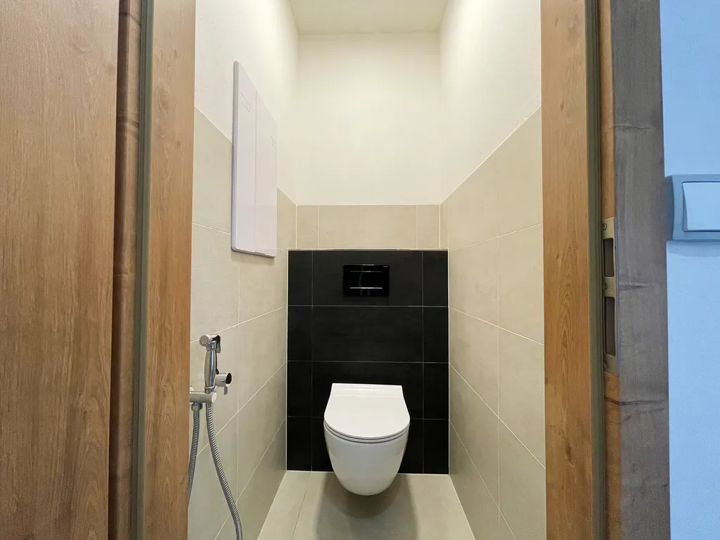 Byt dále disponuje prostornou koupelnou (cca 7 m²) s rohovou vanou, umyvadlem a pračkou. Samozřejmostí je oddělené WC.