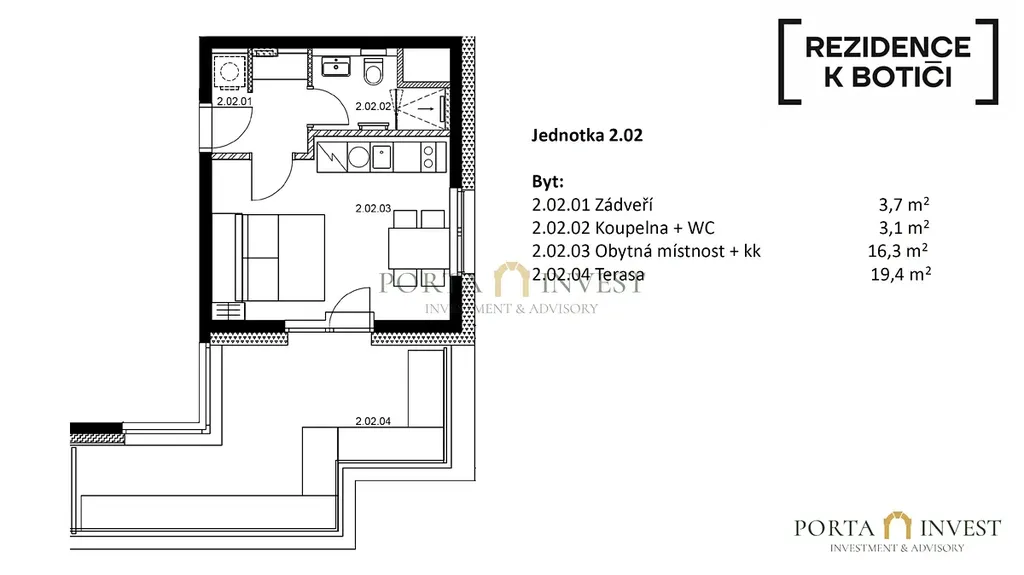 Jako developer nabízíme byt 1+kk (2.NP), které má duši. Ačkoli má vnitřní výměru kompaktních 24,5 m², pocitově je dvojnásobný. Stačí otevřít velkoformátové francouzské okno a váš obývací pokoj se rozlije na obrovskou jižní terasu s výměrou 19,4 m².