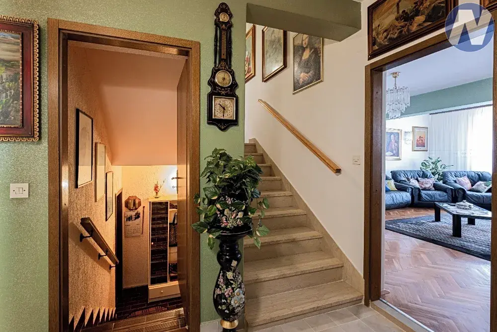 V mezipatře se nachází pohodlná ložnice, zatímco první patro nabízí tři další ložnice, druhou koupelnu a velkou terasu o velikosti 20 m², která je ideální pro relaxaci nebo vychutnání si výhledu. Součástí domu je i vhodně umístěný úložný prostor v podkroví.