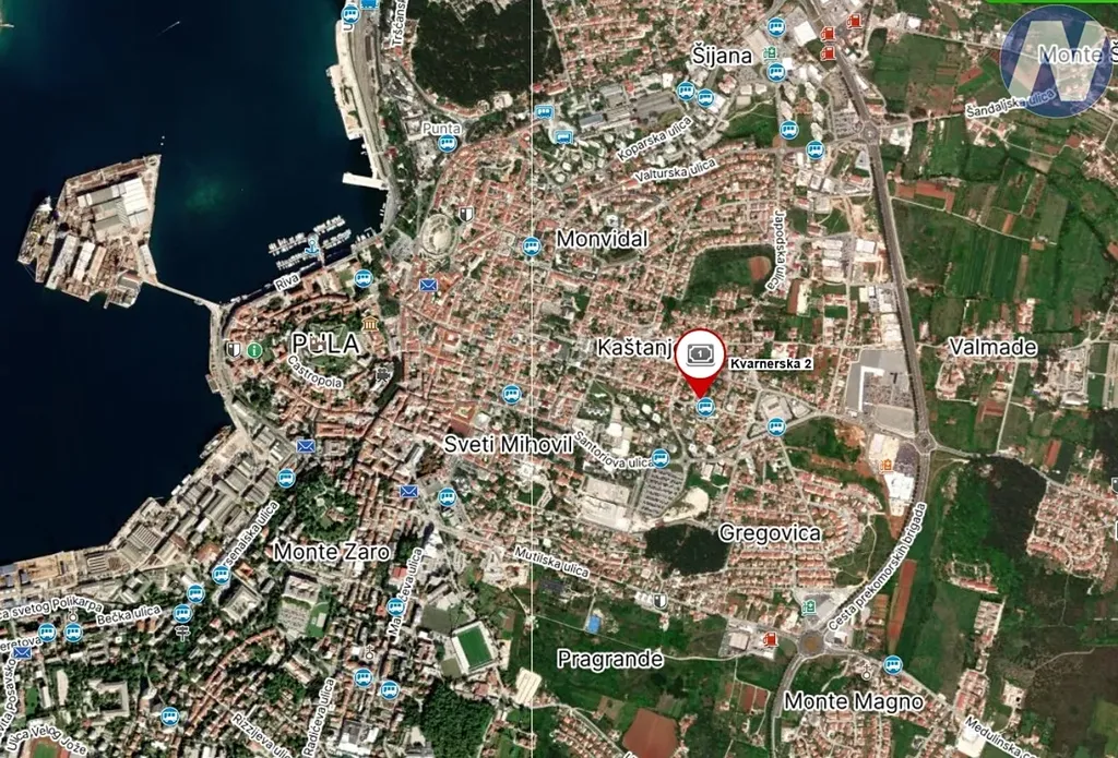 Lokalita je mimořádně praktická pro každodenní život: v docházkové vzdálenosti je supermarket, mateřská škola, základní škola, lékárna, nákupní centrum City Mall a autobusová zastávka přímo před budovou. Byt je přibližně 1 km od historického centra Puly, 3 km od dálnice, 3,5 km od letiště a zhruba 4 km od dobře dostupných pláží. Pula je živé město s bohatým kulturním i sportovním vyžitím, krásnými ikonickými místy i klidnými zákoutími s atmosférou tisícileté historie. V přístavu lze využívat znamenité celoroční kotviště jachet. Pro české klienty je velkou výhodou snadná dostupnost po dálnici i mezinárodní letiště – Pula patří k nejbližším destinacím s teplým a čistým mořem a je skvělým výchozím bodem pro poznávání celé Istrie.