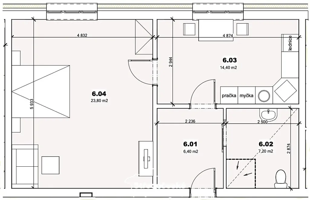 - šest bytových jednotek 1+kk (od velikosti 21,9 m2 do 33,3 m2)