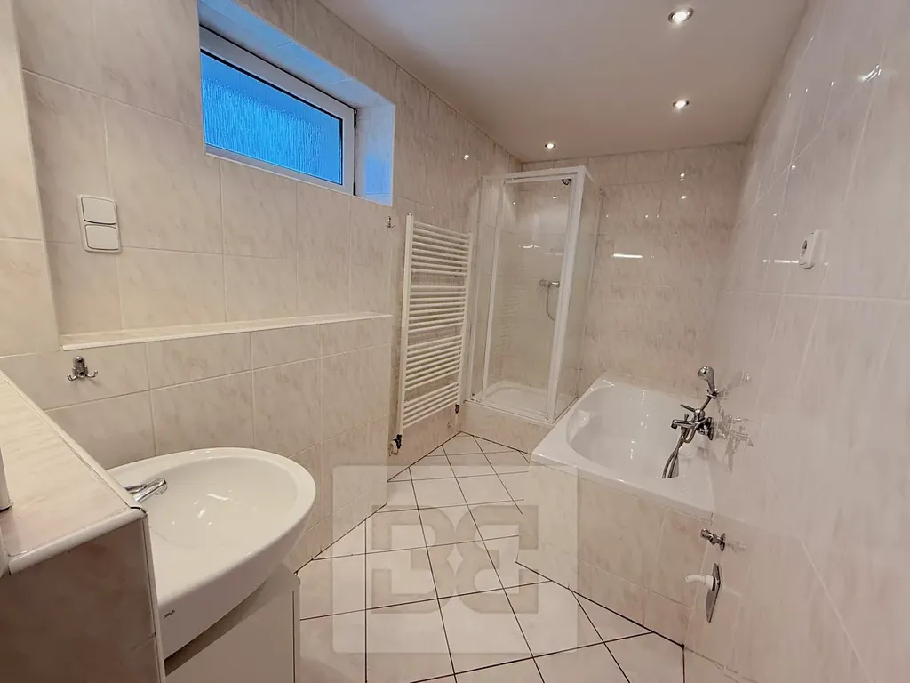 • Koupelna s vanou, sprchou, umyvadlem a přípojkou na pračku